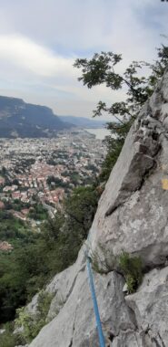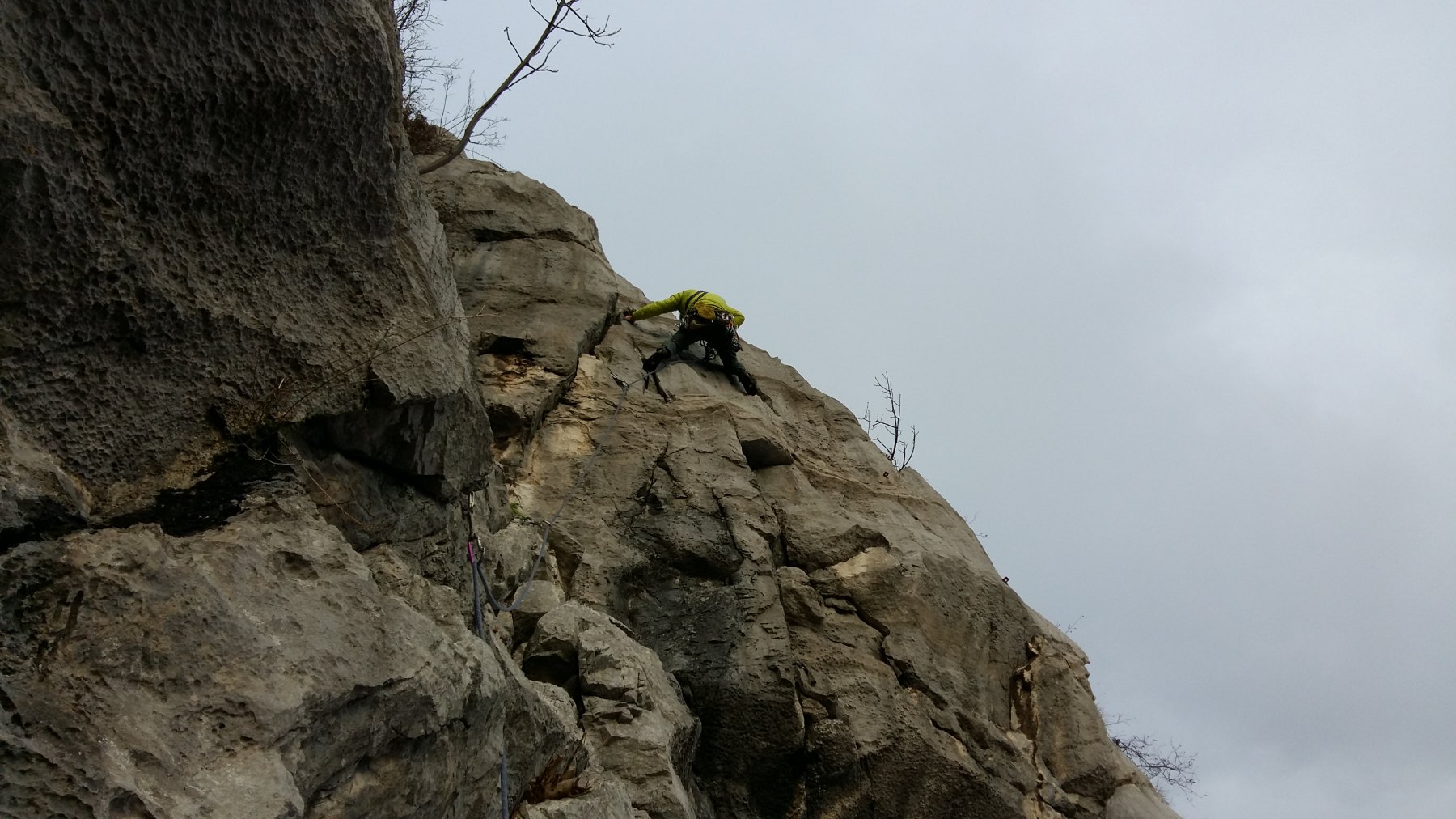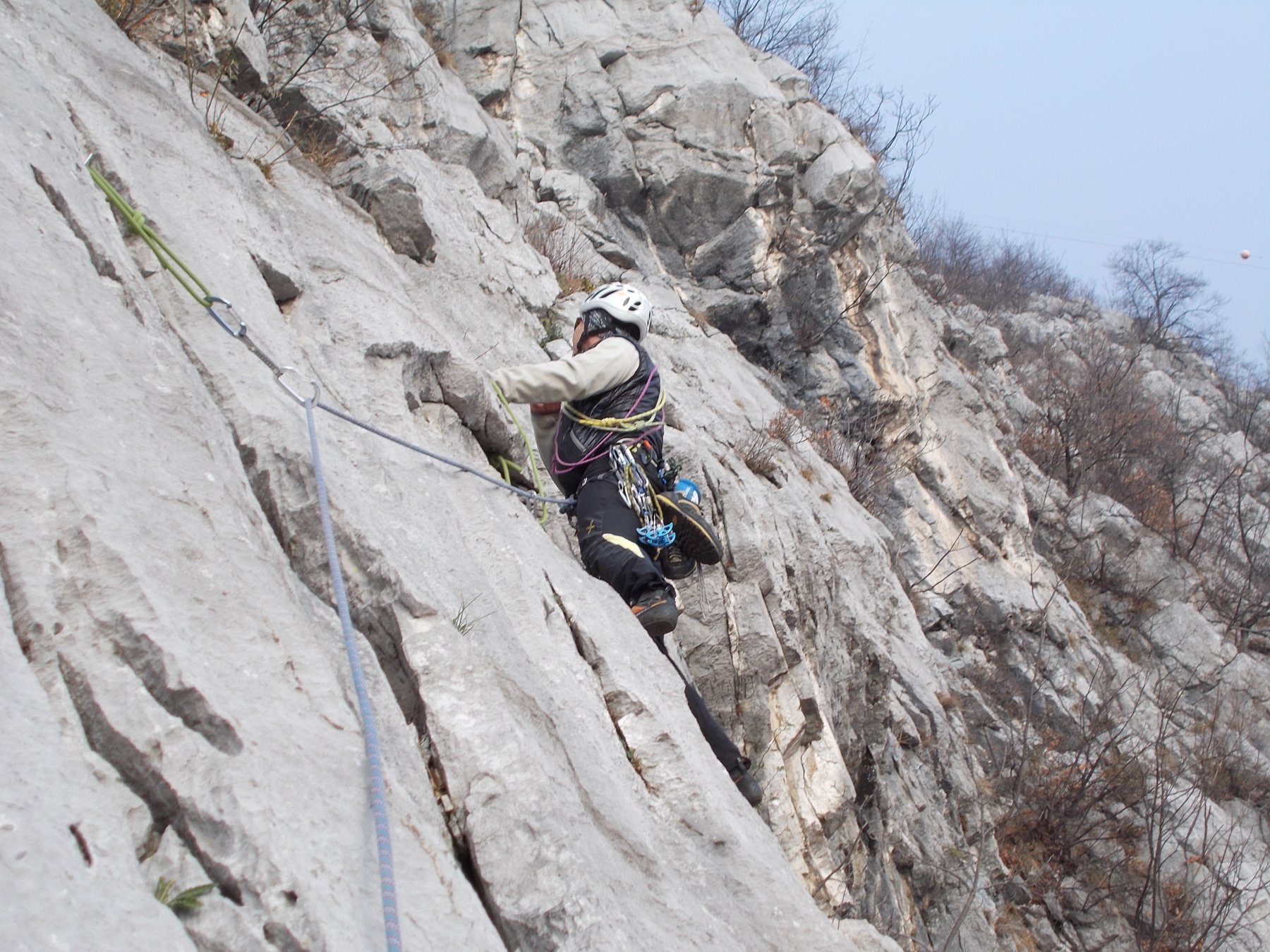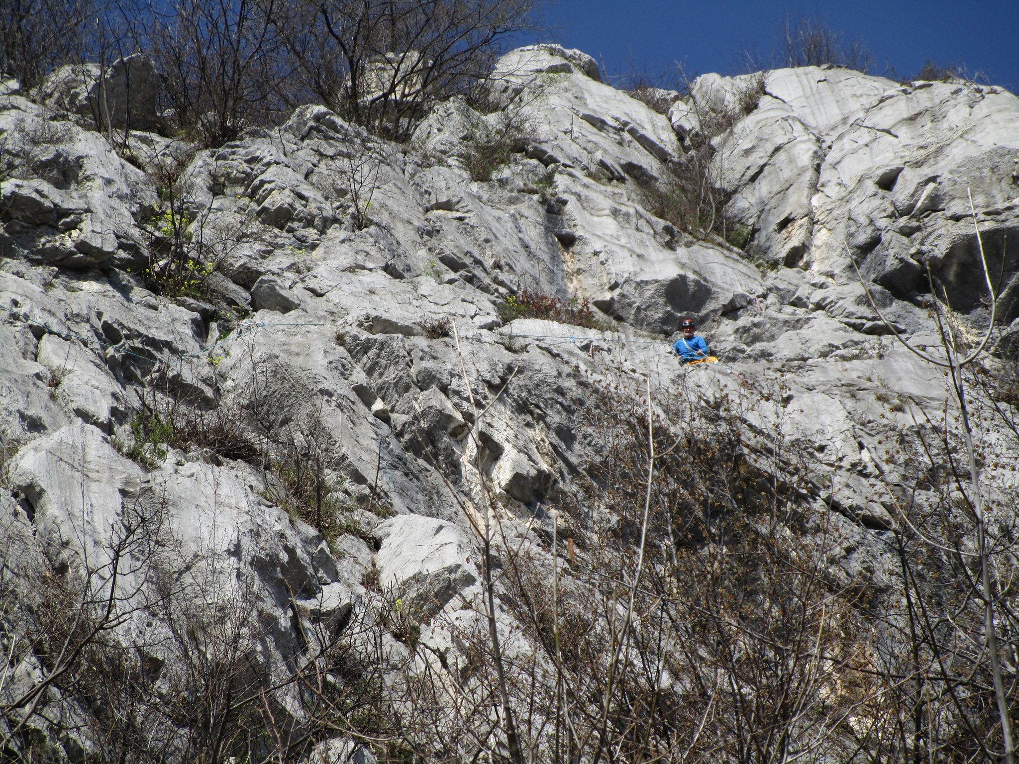 - L1, IV, 30 metri: salire la placca fessurata, poi attraversare a sinistra e proseguire per una placca più verticale. In prossimità di un tettino sulla destra, non si continua dritti (roccia delicata), ma si traversa a destra sopra il tettino, per continuare poi per bella fessura. Si sale infine verso la sosta a sinistra (numerose clessidre cordonate).