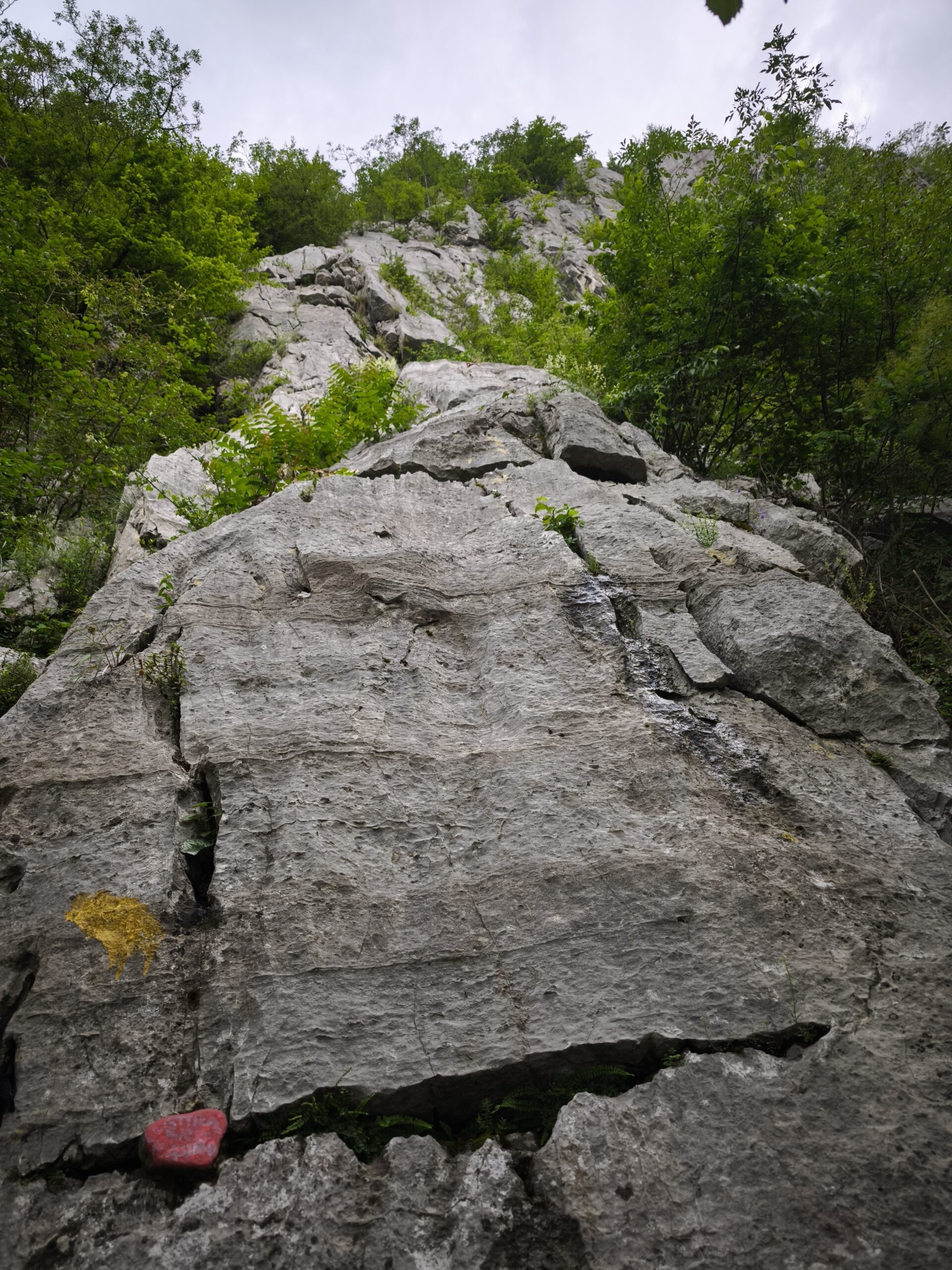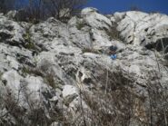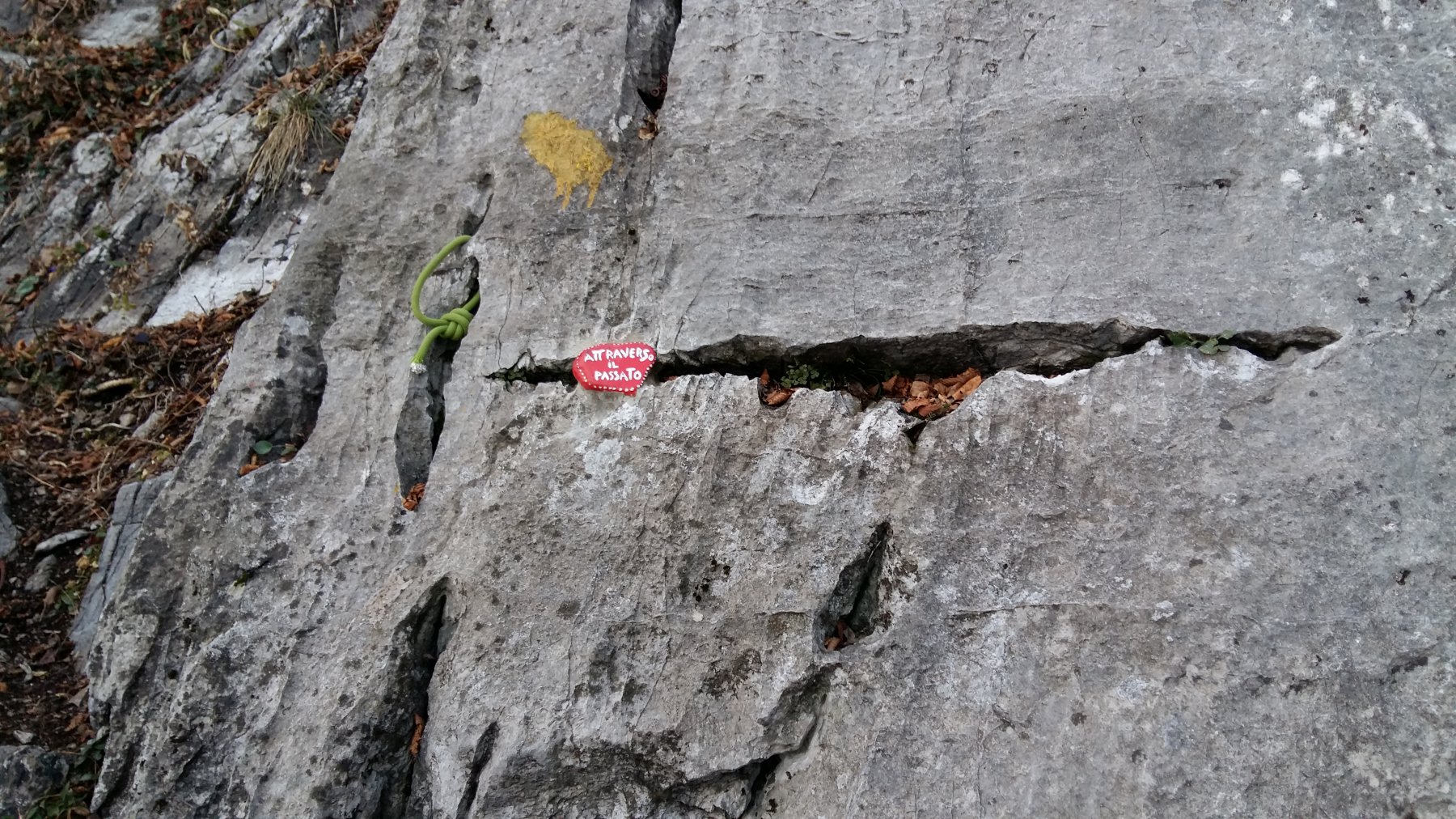 Lasciarle sulla destra proseguendo per un breve tratto sul "Sentiero della Vergella" (bolli gialli segnavia), che porta in breve alla base di un avancorpo roccioso, poco prima di un tratto verticale attrezzato con catene, ben visibile sulla sinistra (0h20).
