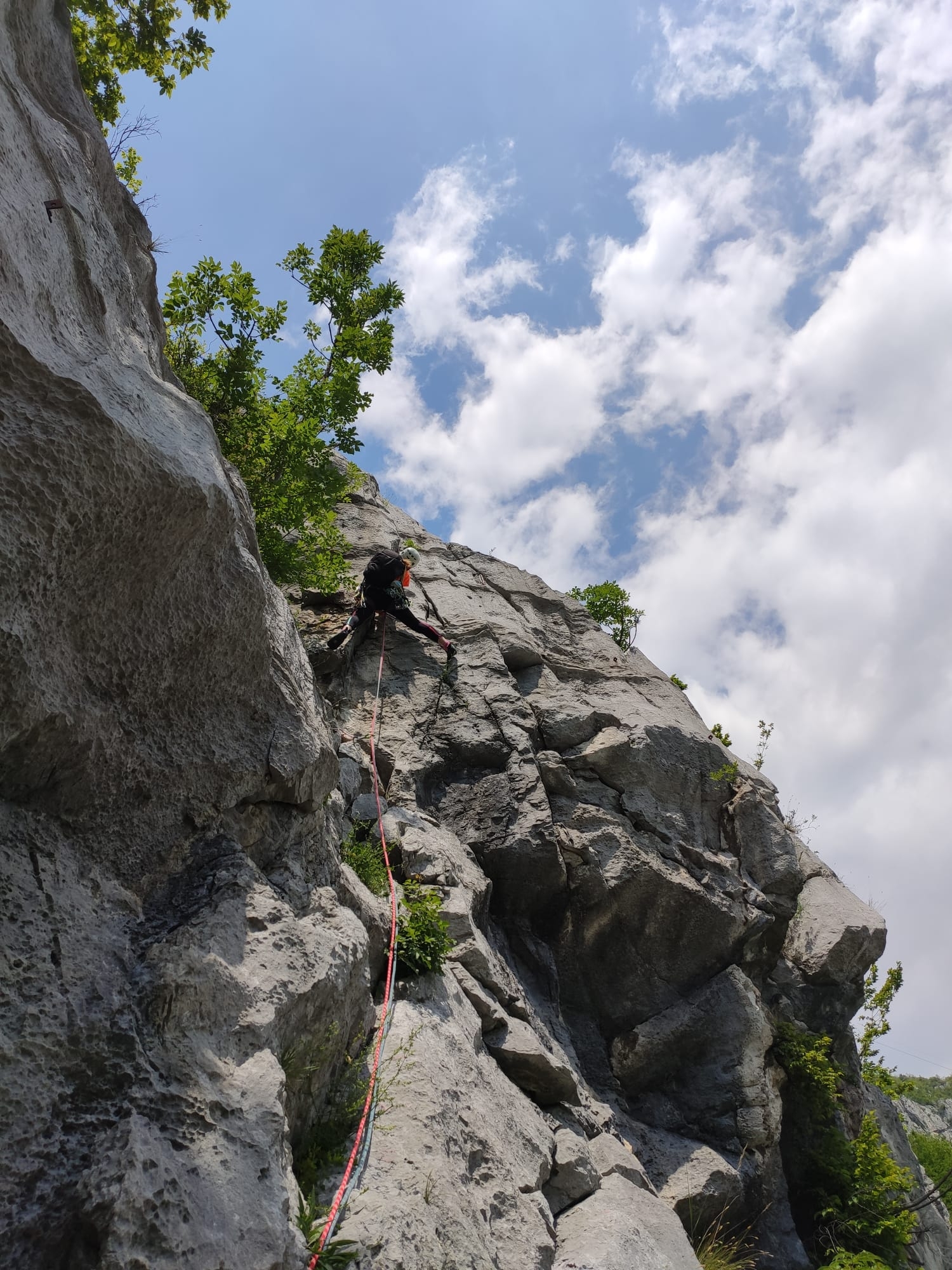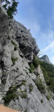 - L3, IV, VI, III+, 35 metri: salire verso destra fino alla base di una fessura verticale, superarla direttamente (cordoni in posto) uscendo a destra su placca fessurata. Continuare poi in verticale fino ad un terrazzino (clessidra attrezzata con cavo d’acciaio e cordone), proseguire su placca abbattuta ed uscire dalla parete su una comoda cengia, posta al limite del bosco sommitale. Sostare su clessidra cordonata o su pianta sulla sinistra. In posto il libro di via, custodito all’interno di un contenitore.