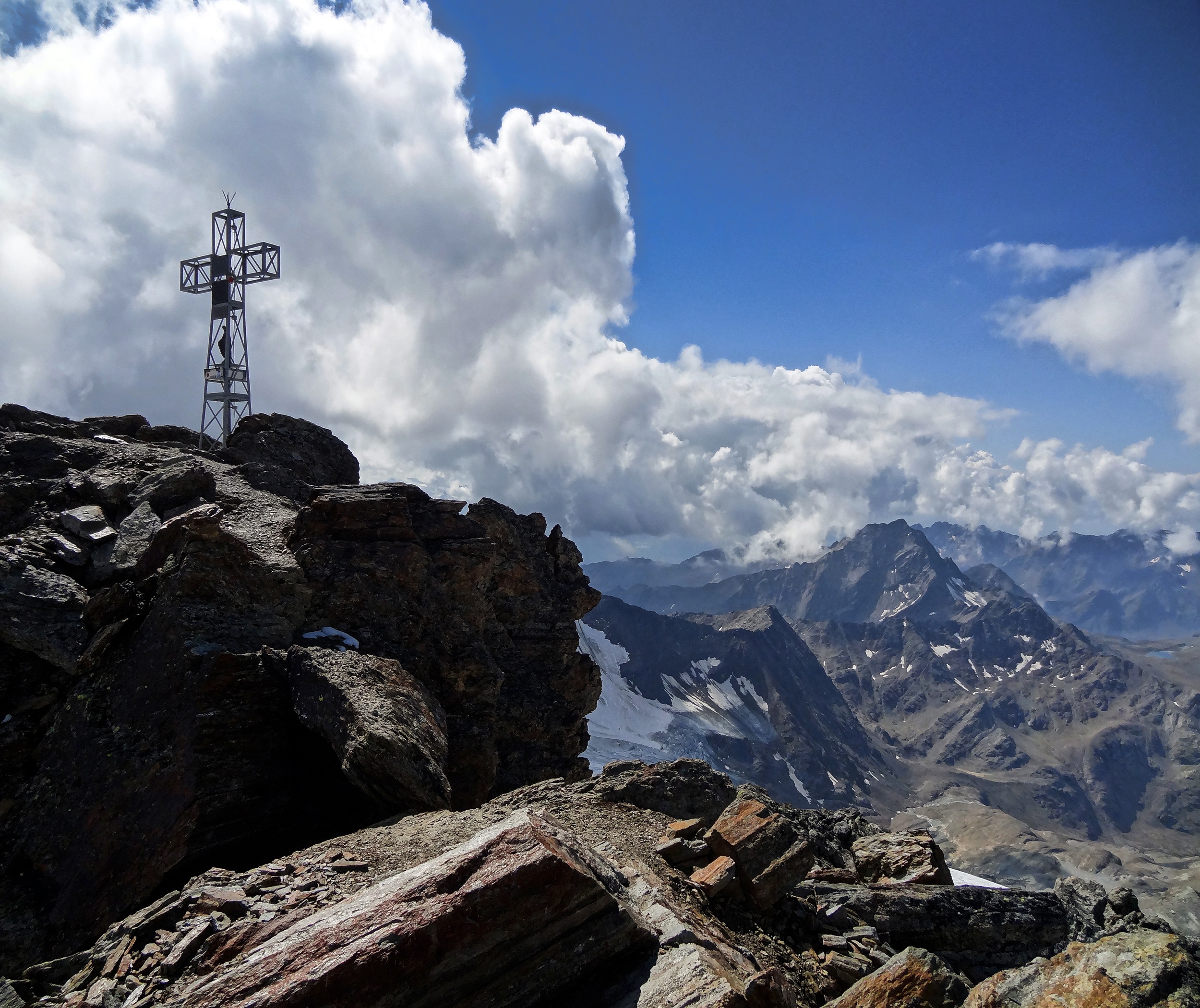 Il giorno dopo si segue tutta la cresta, eventualmente tagliando lato E la prima cima (Cima di Valleumbrina) e poi superando in successione il Pizzo Valleumbrina (m 3224), la Cima Villacorna (m 3452) e il Monte Martello (m 3517), con numerosi saliscendi e passaggi rocciosi (II) intervallati a tratti detritici o chiazzati di neve, raggiungendo la base della cresta finale SW del San Matteo. Se questa non è in condizione, si traversa a sinistra tutta la base del monte raggiungendo la