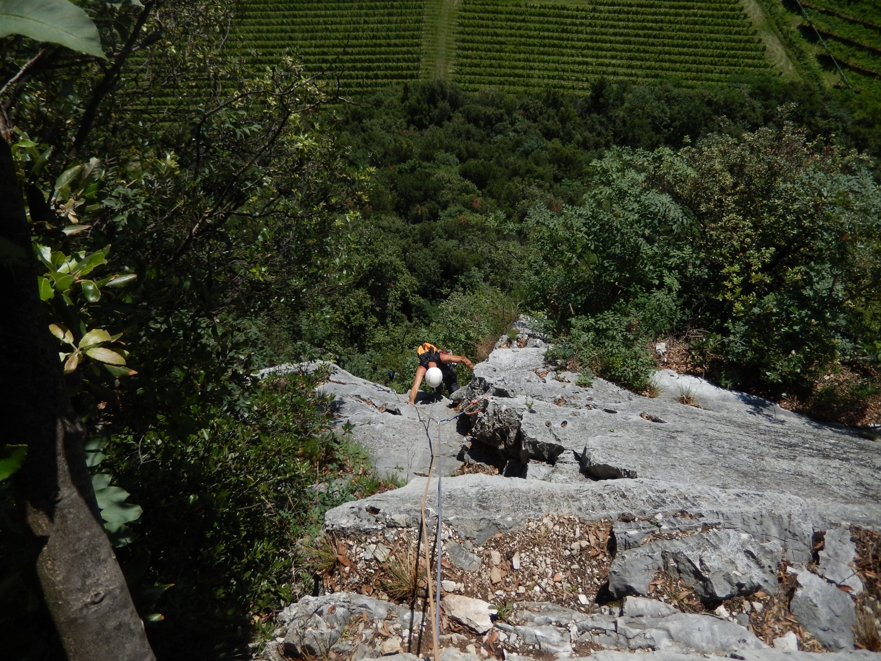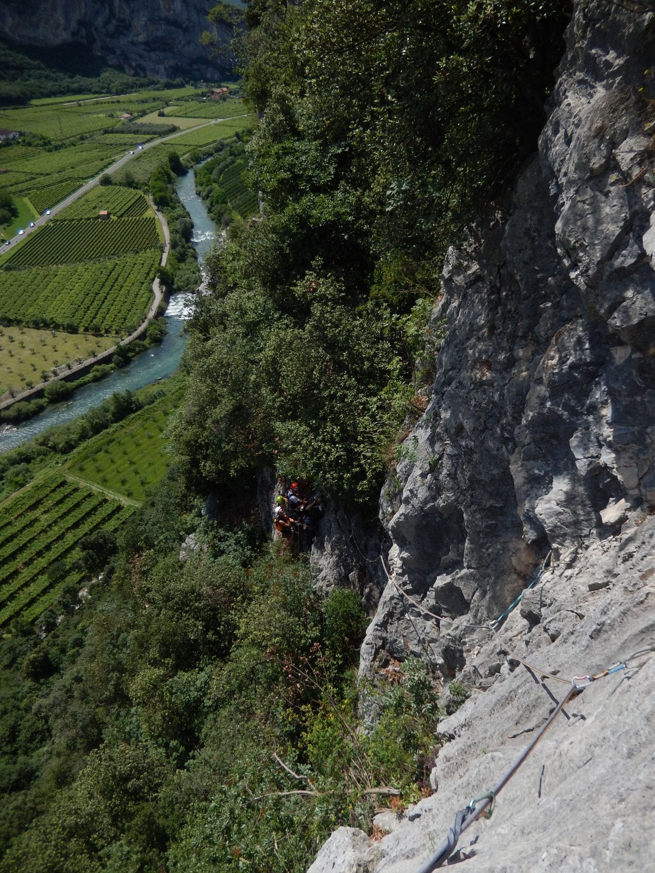 I primi due tiri seguono un’elegante e ripida linea fra grandi tetti. Poi una facile rampa permette di passare la seconda metà della parete. Segue poi una linea obliqua ascendente verso dx.