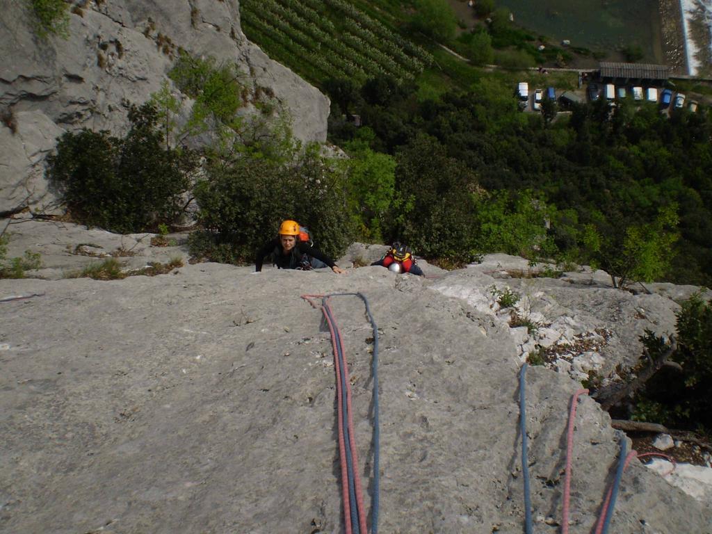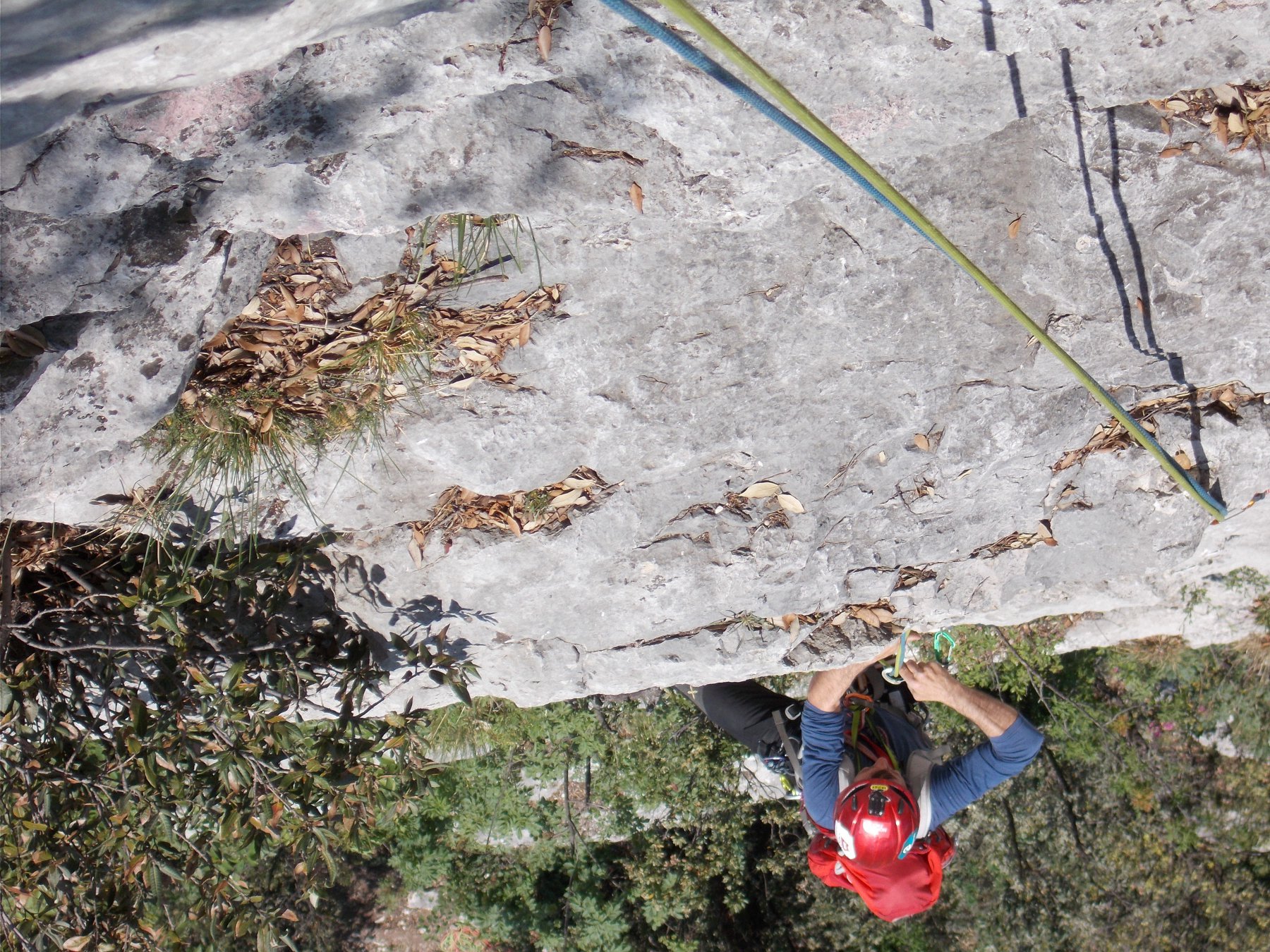 Tiro ben protetto anche se gli spit non sono ravvicinati. Dall’ultimo spit della variante, obliquare decisamente a sx verso la visibile sosta e non (come ho fatto io) proseguire dritti per poi traversare a sx: passo difficile molto lontano dallo spit. Sosta scomoda.