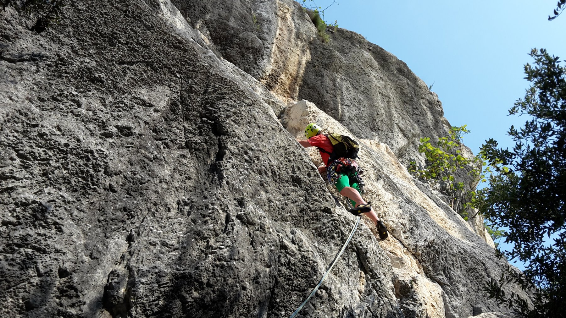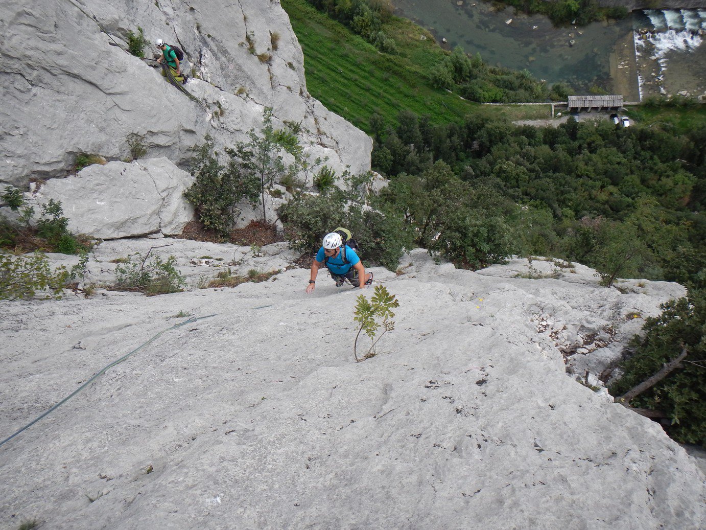 Sesto tiro: tiro chiave della via, se si fa la variante di VI come noi. Entusiasmante arrampicata su placca, abbastanza tecnica e di spalmo di piedi. Partenza un po’ problematica da dopo la sosta. Poi attraversare a dx, prima spit, poi ottimo chiodo nuovo. Per questo traversino usare l’appiglio a sx del chiodo, dentro alla fessura stessa del chiodo.
