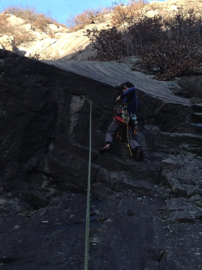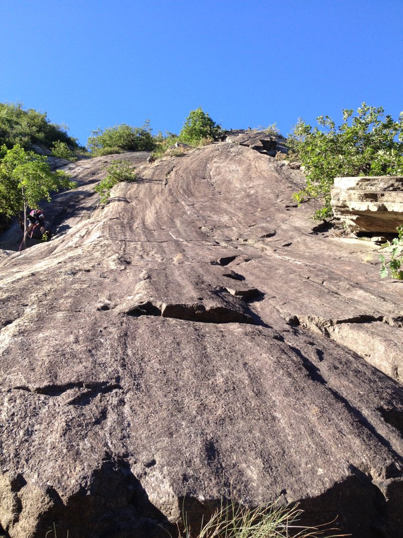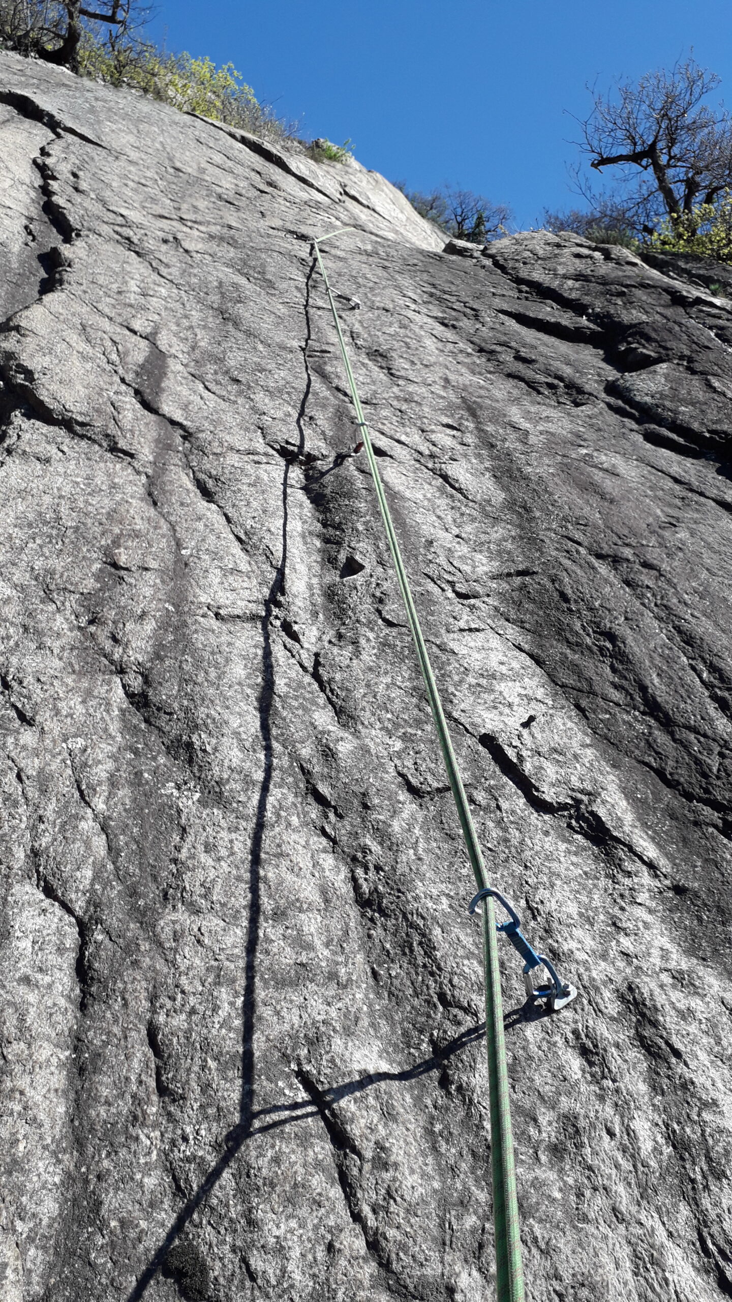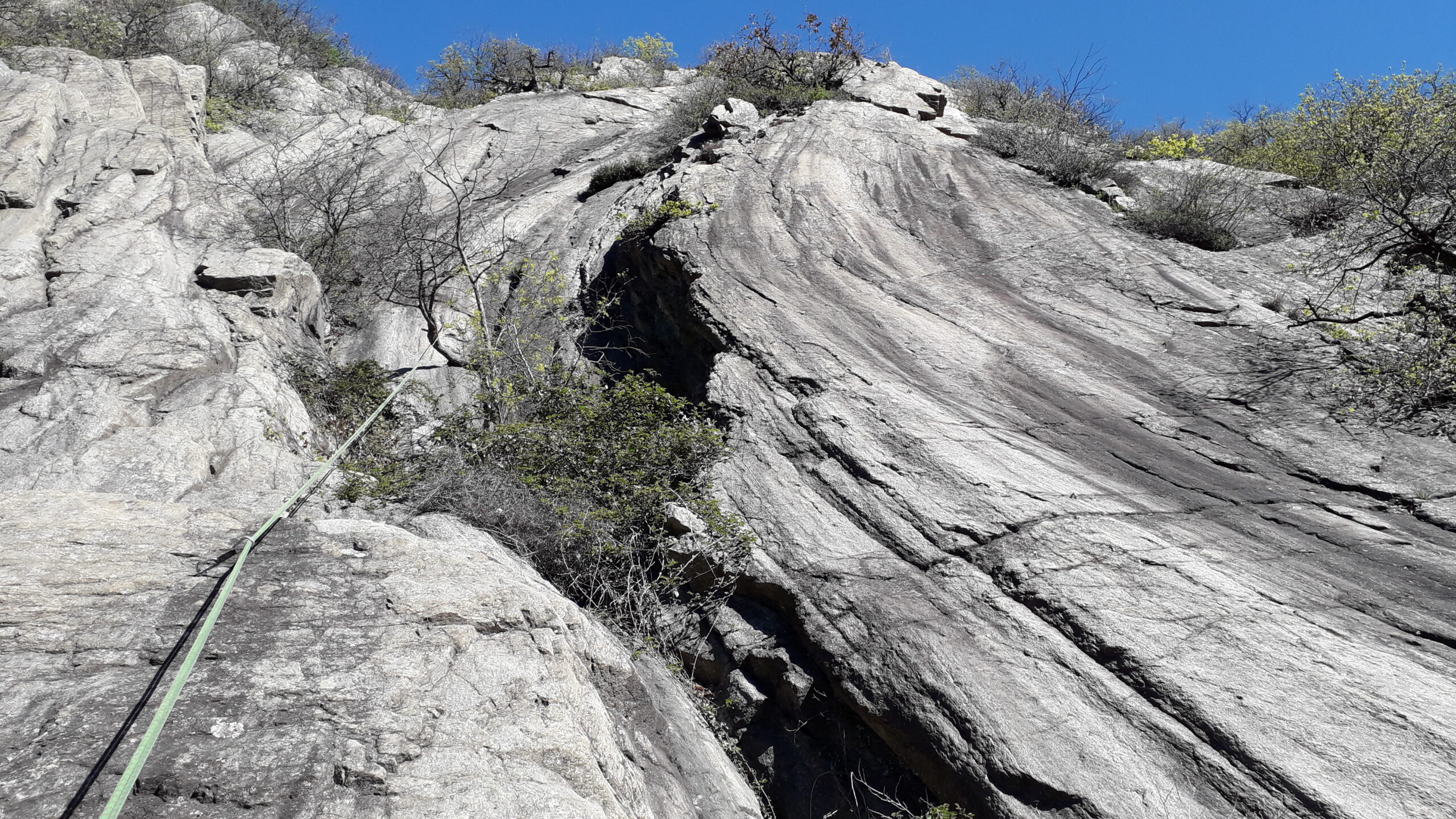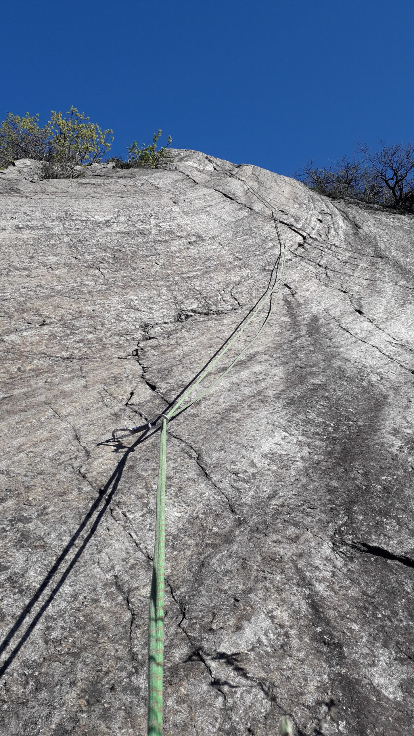 L2 bellissima placca inizialmente abbattuta (5a), che si verticalizza progressivamente (6a+, passo di 6b evitabile spostandosi decisamente a destra) fino alla sosta su terrazzino (25 m);