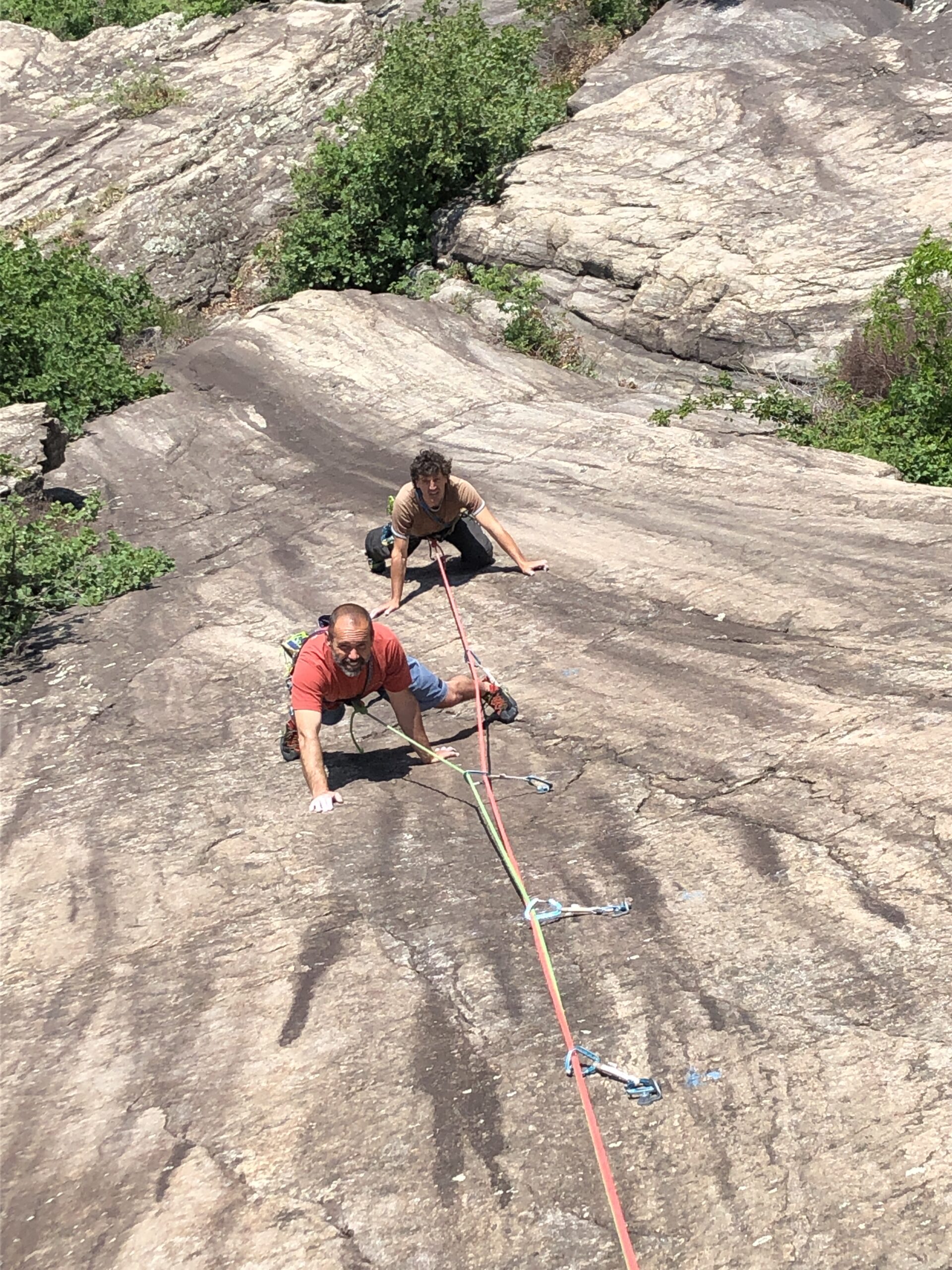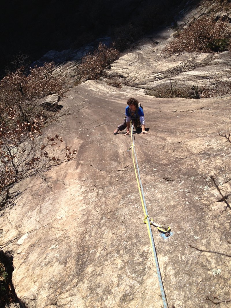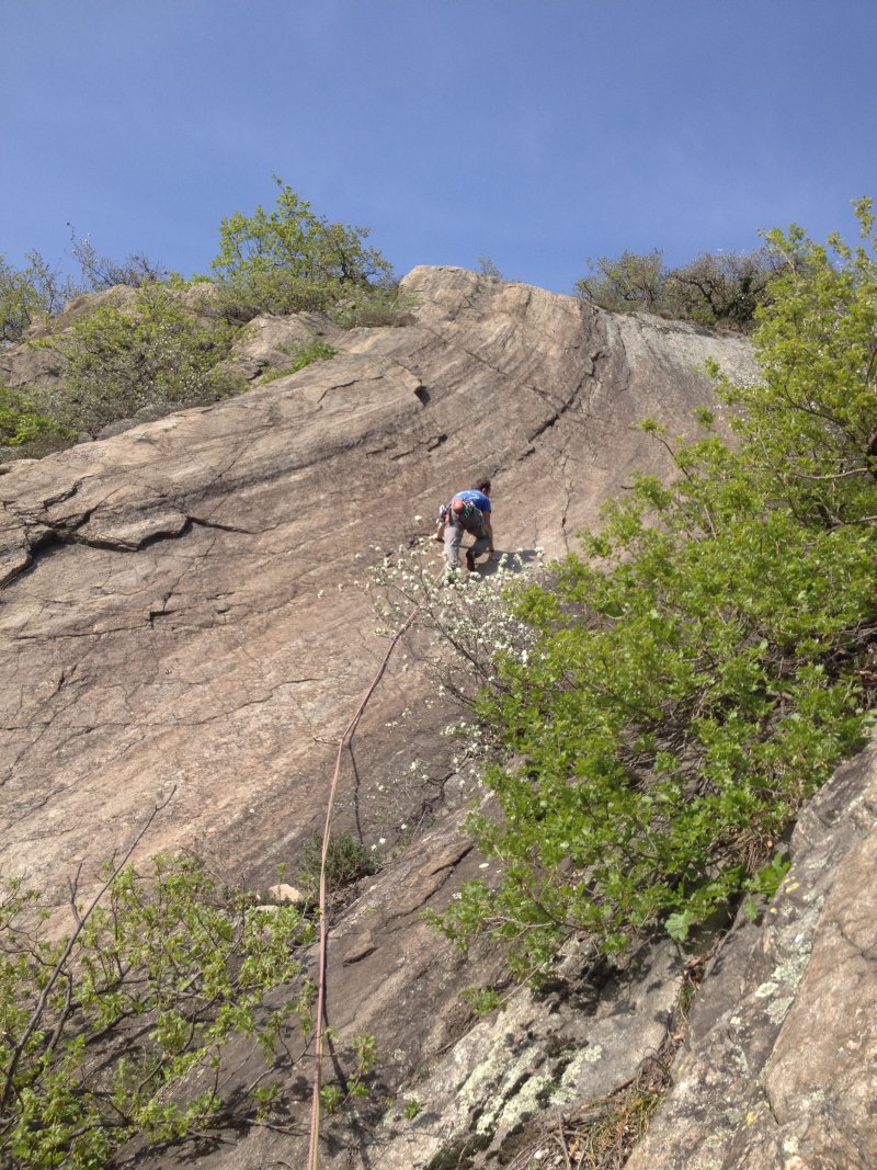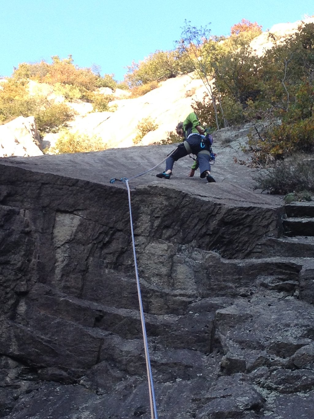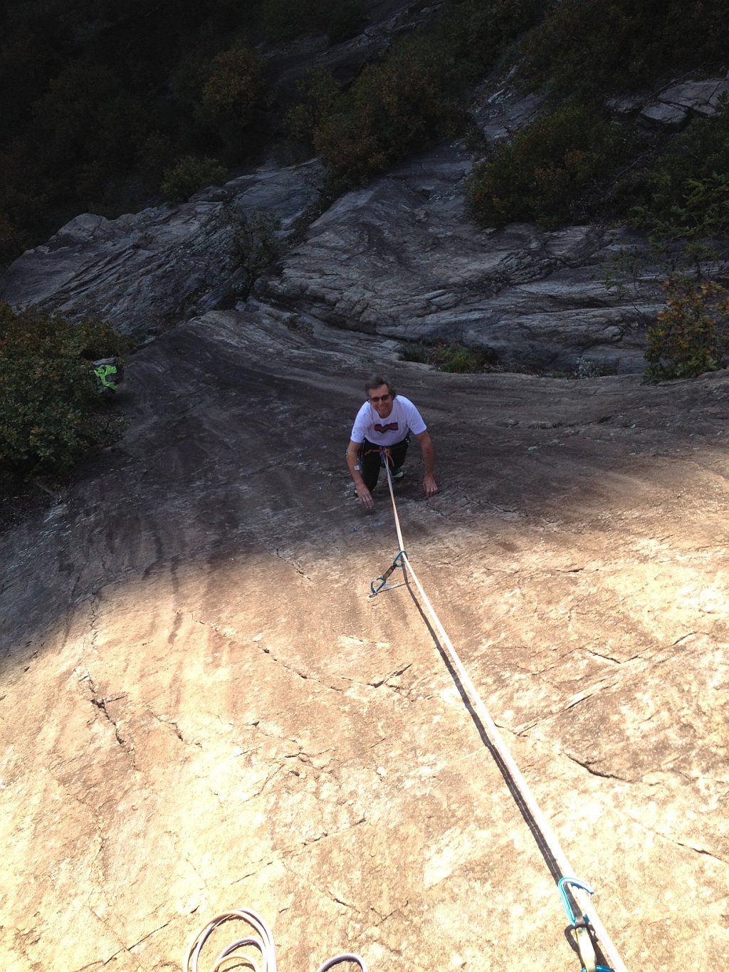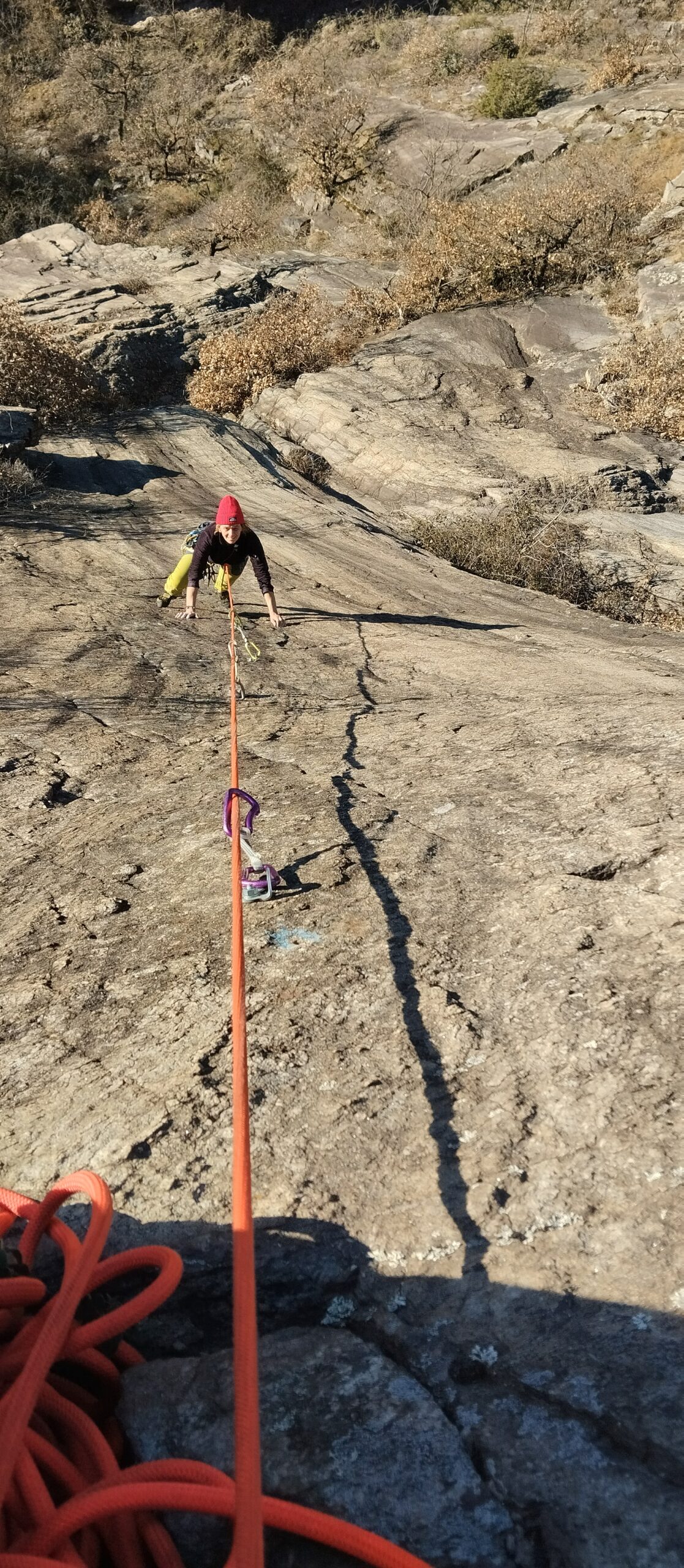 L2 bellissima placca inizialmente abbattuta (5a), che si verticalizza progressivamente (6a+, passo di 6b evitabile spostandosi decisamente a destra) fino alla sosta su terrazzino (25 m);