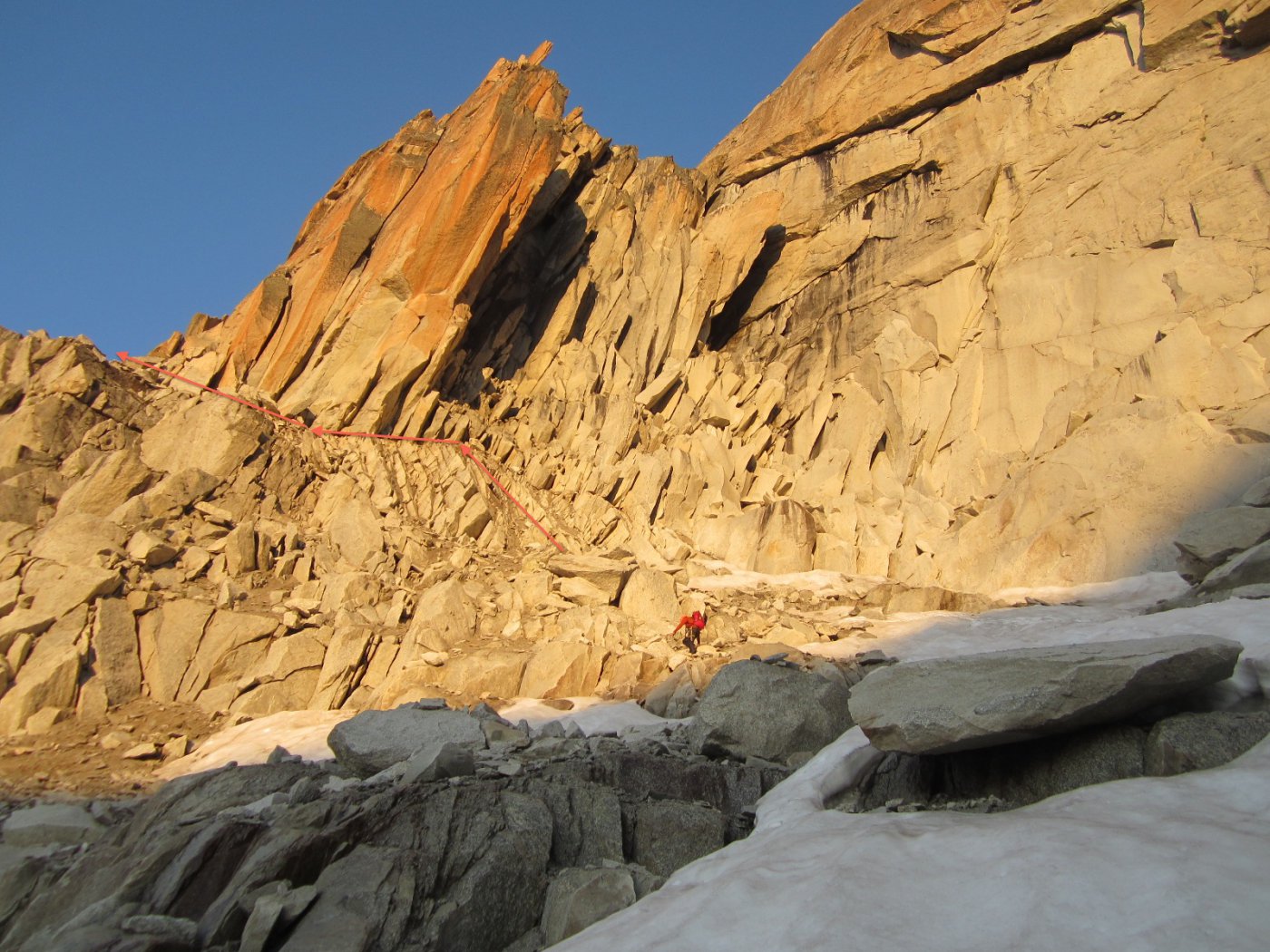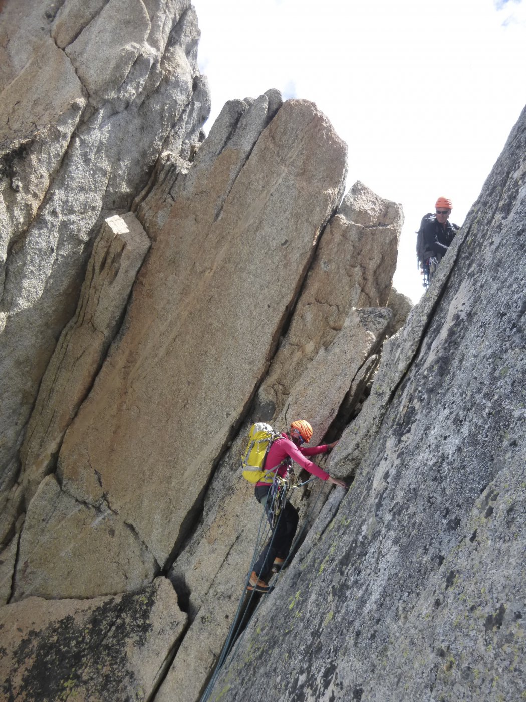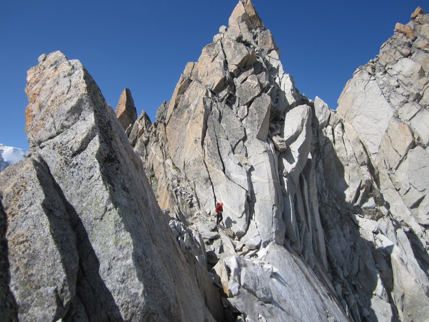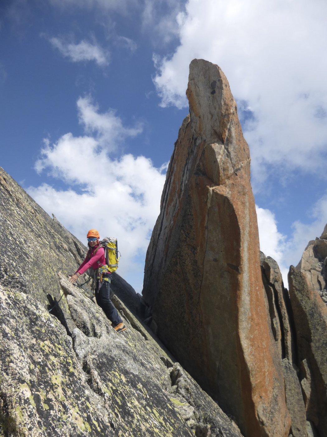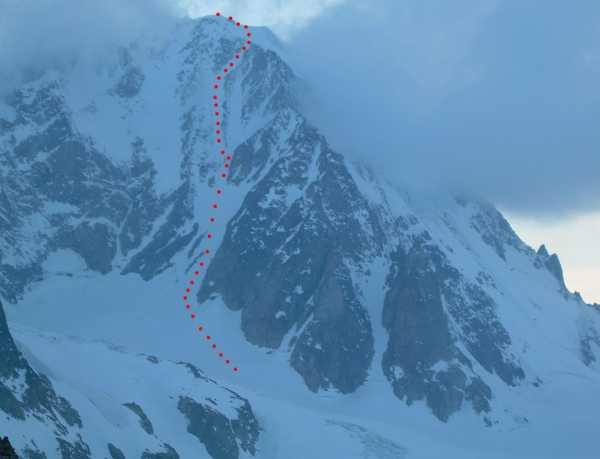 Dal punto di attacco tirare dritti su facile roccia, II e III grado, dirigendosi verso il filo della cresta a dx che delimita il canale che sale fin sotto la cima, qualche spit presente; raggiunto il filo continuare lungo lo stesso su bella roccia con passaggi massimo di IV grado; poco sotto la punta sud si interseca l’itinerario della traversata dell’Aiguille Dorees;