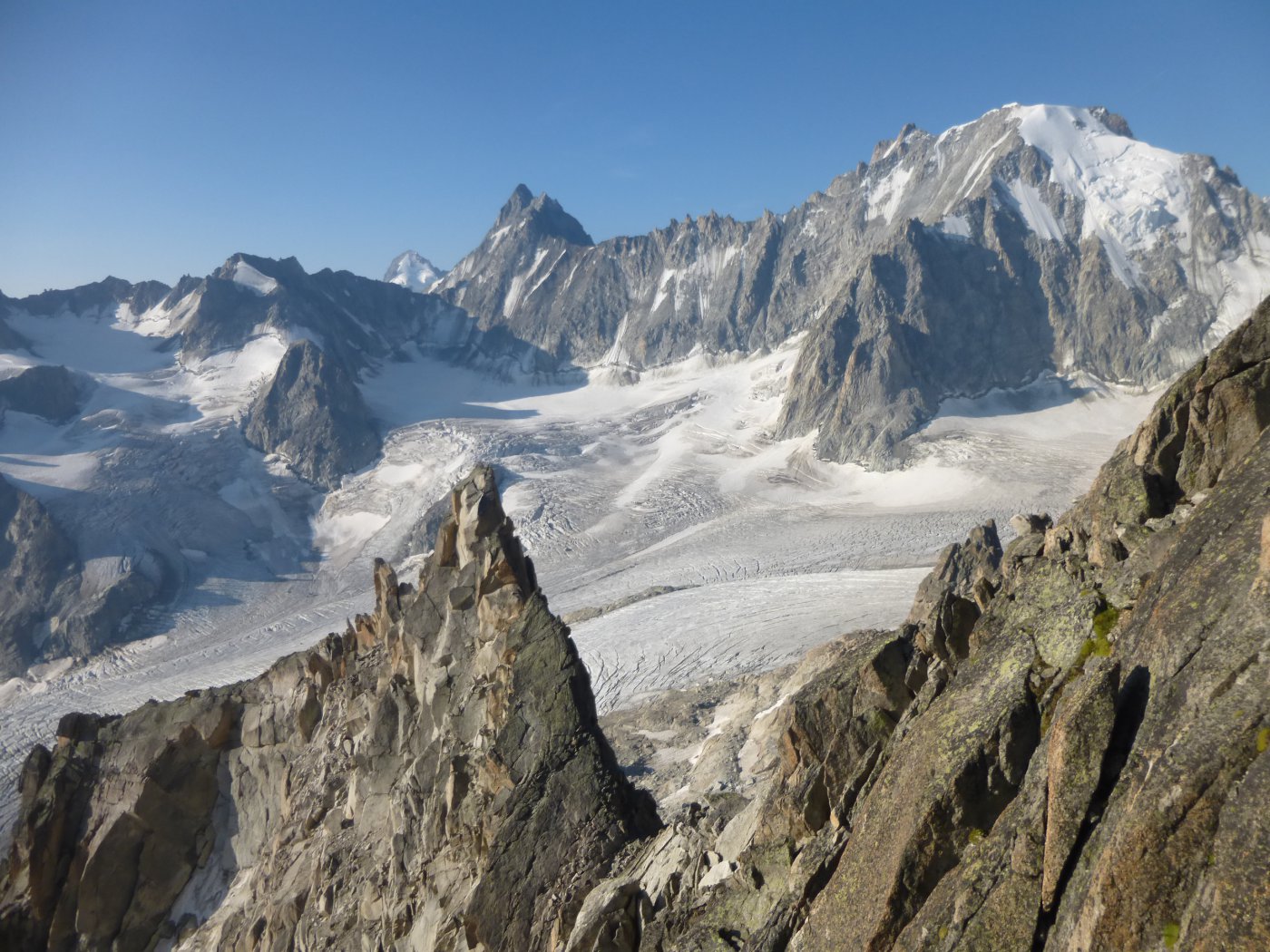 raggiunta una zona di sfasciumi sulla sx, lato Trient, sono presenti delle nuovissime soste di calata da 45 metri che in breve depositano sul ghiacciaio di Trient; altrimenti e’ possibile proseguire la traversata fino alla Breche Crettez e quindi scendere sul Ghiacciaio di Trient.