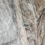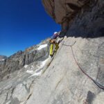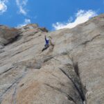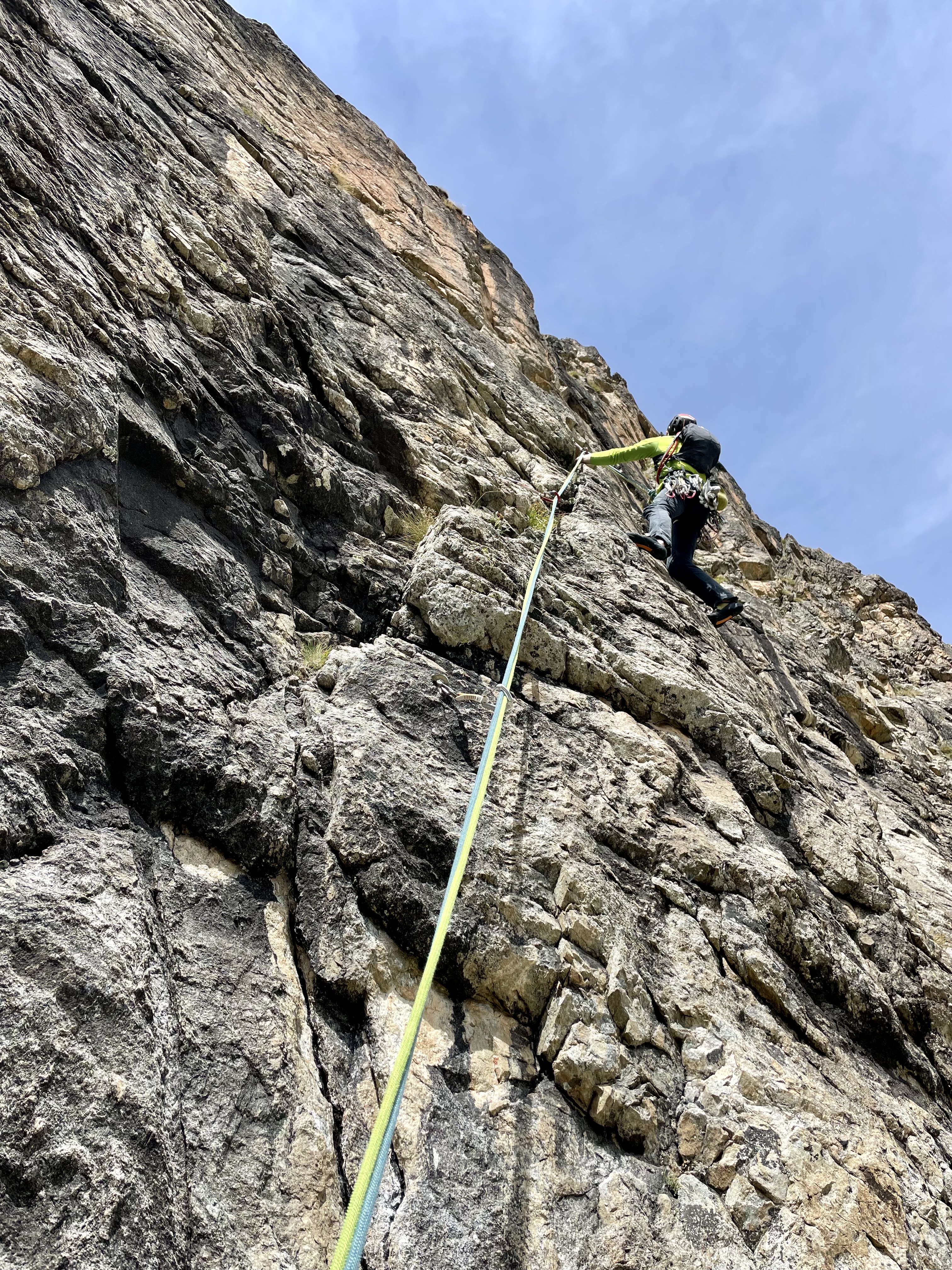- L1: 55m, 5c. Si parte con 15 metri di placca aderenza senza spit per ritiro ghiacciaio appena a sinistra della fessura originale e poi misto di placche compatte e roccia molto friabile