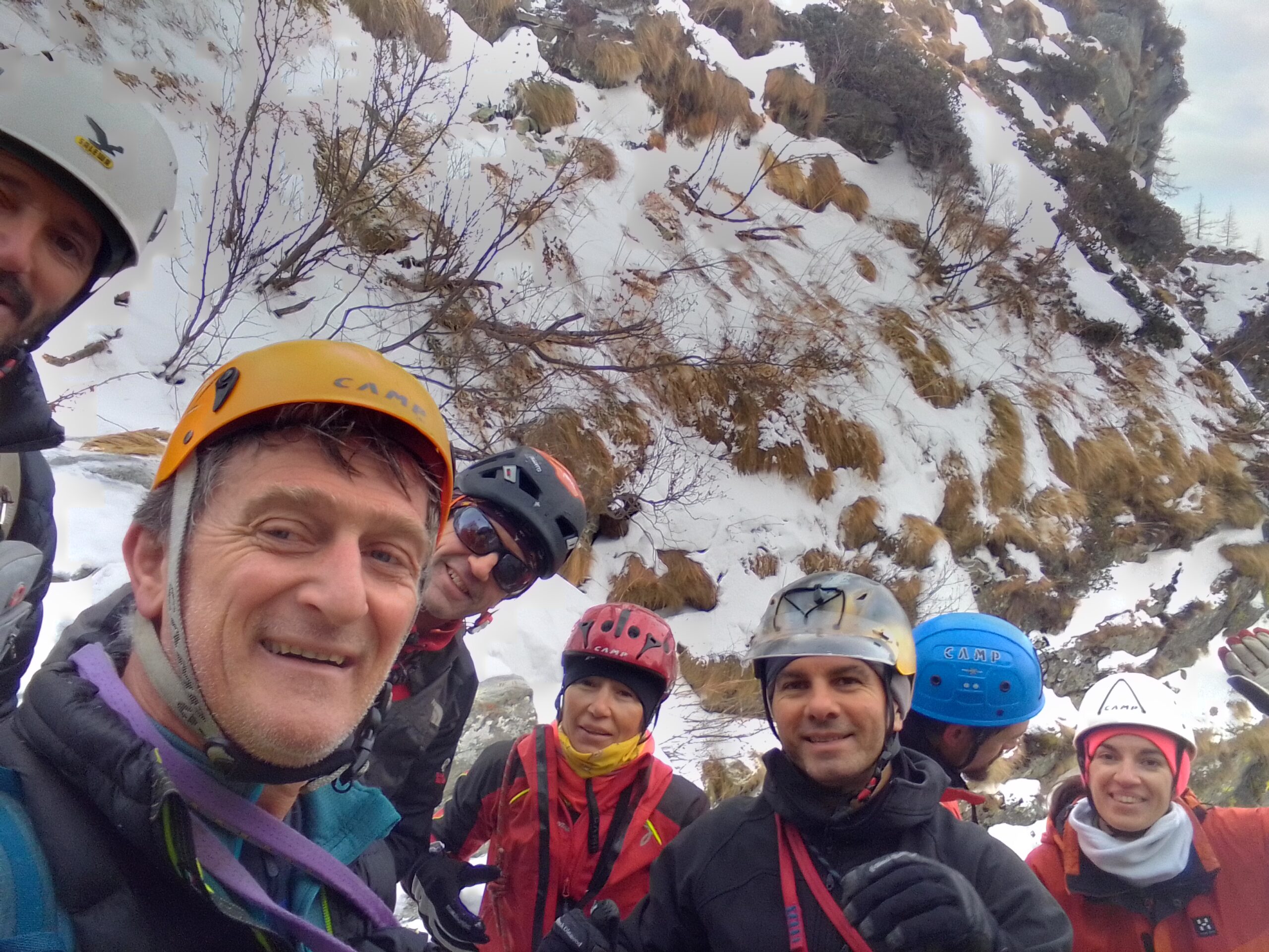 Primo tiro ,solido zoccolo, poi per chi vuole quando la cascata e più in salute sicuramente ci sono più linee e ampia, oggi Dario con Alma e Cristian tirato a sx (+dritto tiro da sotto fino ad albero sx 15 m prima dell’ uscita). Io con Max e Edo linea solita. Come detto uscita delicata se si rompe salti dentro!!!