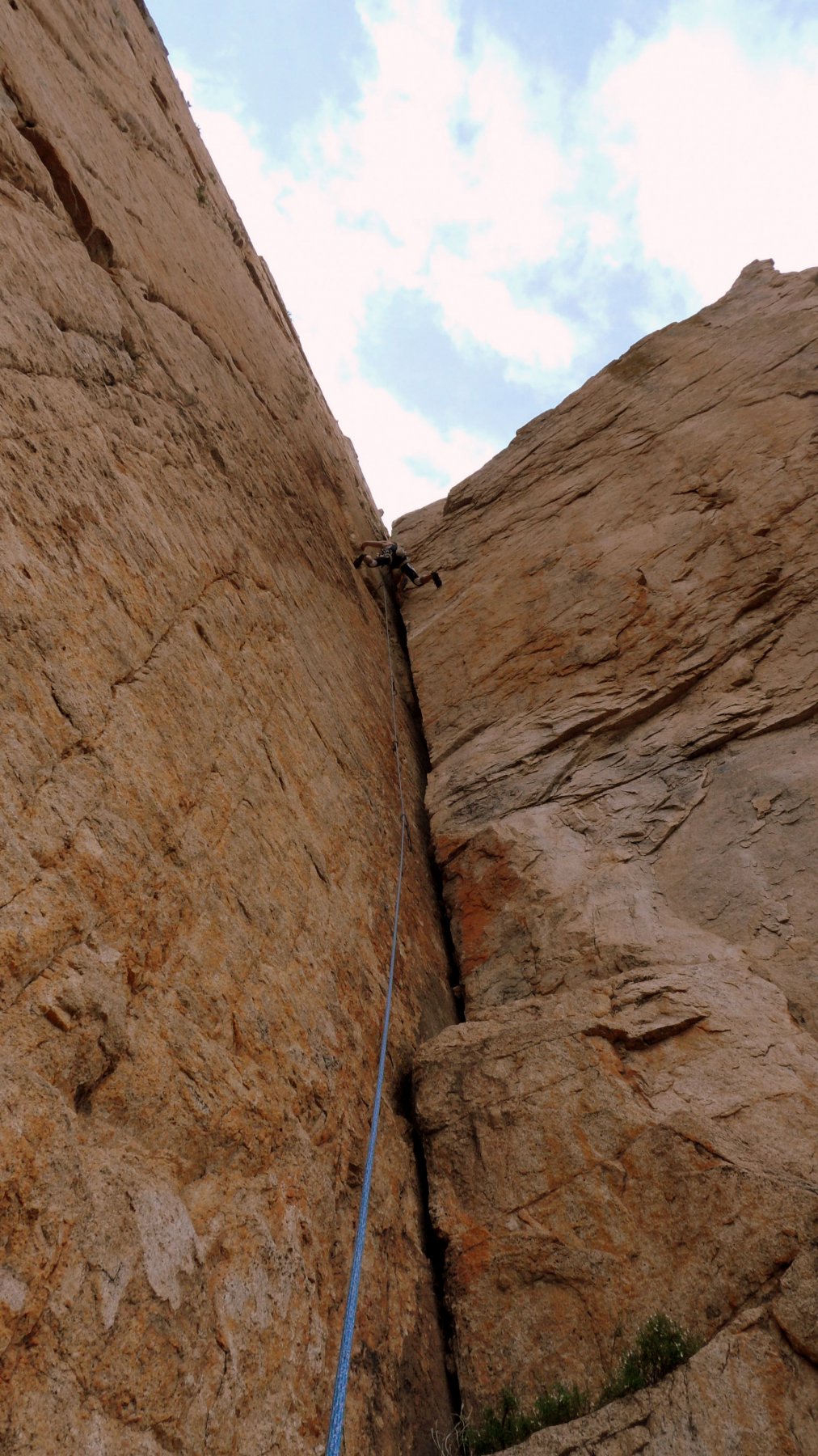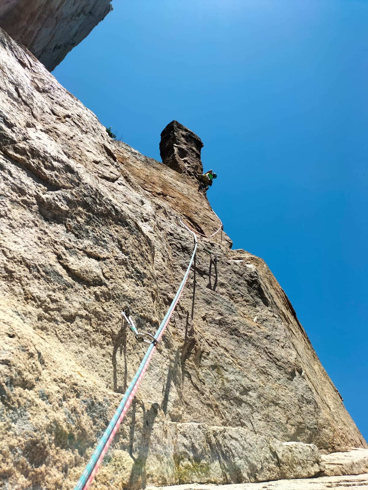 E possibile percorrere tutta la via in un unico tiro, con corda da 70 metri.