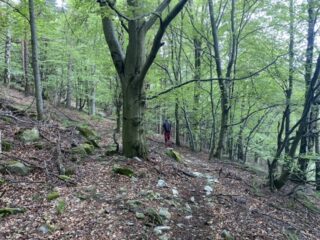 Il sentiero è stretto ma ben segnato ed entra in una splendida faggeta, allargandosi a mulattiera con terreno morbido.