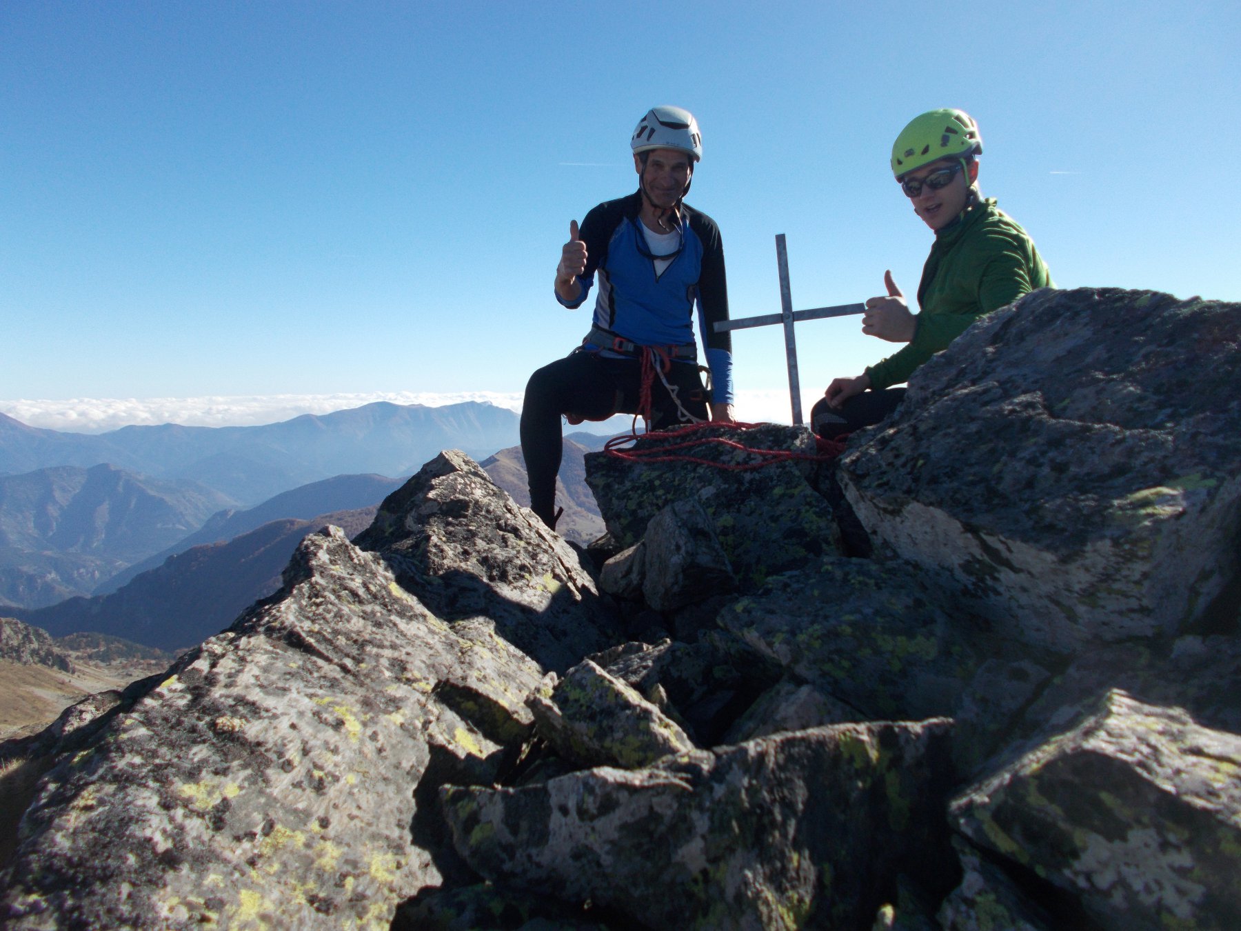Confermo tutto quanto gia’ detto anticipatamente dal gulliveriano Baley93 e socio, incontrato lungo la via e che saluto. E da tutto quanto dira’ il mio socio quando inserira’ lui pure il suo commento. Una via storica nell’insieme breve ma intensa, di una verticalita’ assoluta. Ben chiodata, con abbondanza di chiodi vecchi cosi come di nuovi. Soste in ordine per calate rapide, sia quelle che si scelgono per calare lungo la via moderna a fianco la nostra, che quelle che si effettuano, (due da 30m, gia’ anch’esse ben attrezzate), giu’ lungo la cresta ovest, per scendere al colletto Saragat, che implica l’ultima parte per raggiungere l’erba, il dover scendere un breve tratto in disarrampicata. Non lasciatevi ingannare dalla gradazione a mio avviso fin troppo severa. Queigli ostentati IV, IV+ che si leggono nella relazione dei primi salitori, in falesia risulterebbero come minimo dei 5a 5b, almeno un grado in piu’. Quindi arrivati all’attacco (dopo 1h3/4 di marcia d’avvicinamento), prepararsi per un arrampicata tutto tranne che banale. Ora si provi ad immaginare il dover superare simili difficolta’ ( in riferimento ai singoli passaggi), con la corda che scorre a fatica, in esposizione assoluta, e ancor piu’ con zaino pesante in spalla (e’ nostra abitudine portarcelo sempre appresso). Credo di aver detto tutto..ci sarebbe poi anche un discorso di eta’ da tenere conto..ma lasciamo perdere..alla fine la cosa ci e’ piaciuta comunque, pur con qualche brivido di tipo adrenalinico di troppo, a scorrere rapido giu’ lungo la schiena.