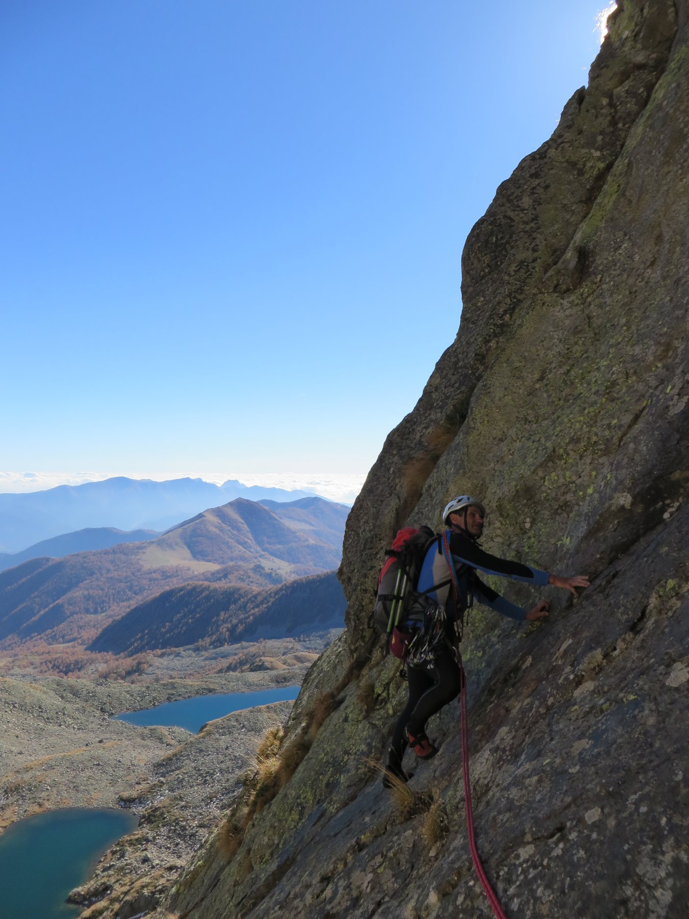 Pensavo di poter essere di maggior aiuto al socio aprendo qualche tiro anche io, ma escludendo la prima lunghezza, le altre sono ancora qualche gradino oltre le mie capacità; rimango con un pò di amaro in bocca per non essere ancora all’altezza in queste salite, che tendo a sporcare un pò per via delle mie mancanze tecniche.