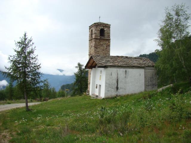 Da qui il panorama spazia liberamente e si individua la sottostante poderale che la si percorre o per tagli si raggiunge la cappella del Kiri 1650m (San Pietro in Vincoli) passando dall’alpe Champas 1690m.