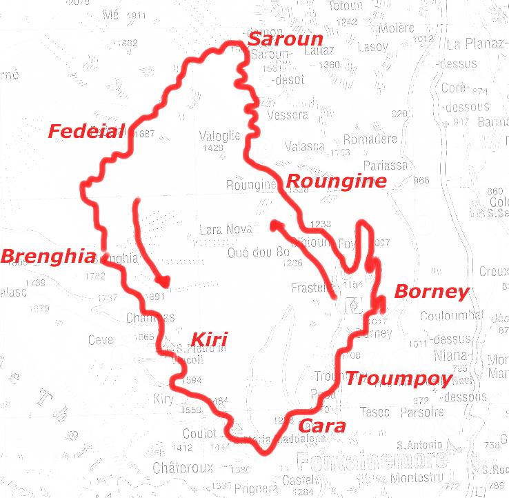 Dalla cappella del Kiri, sul frontale, è ben individuabile il sentiero n.1 che scende decisamente, attraversando più volte la poderale e le località di Kiry 1550m, Coulot con la chiesa di s.m. Maddalena 1447m, Cara 1230m e Trounpoy 1100m.