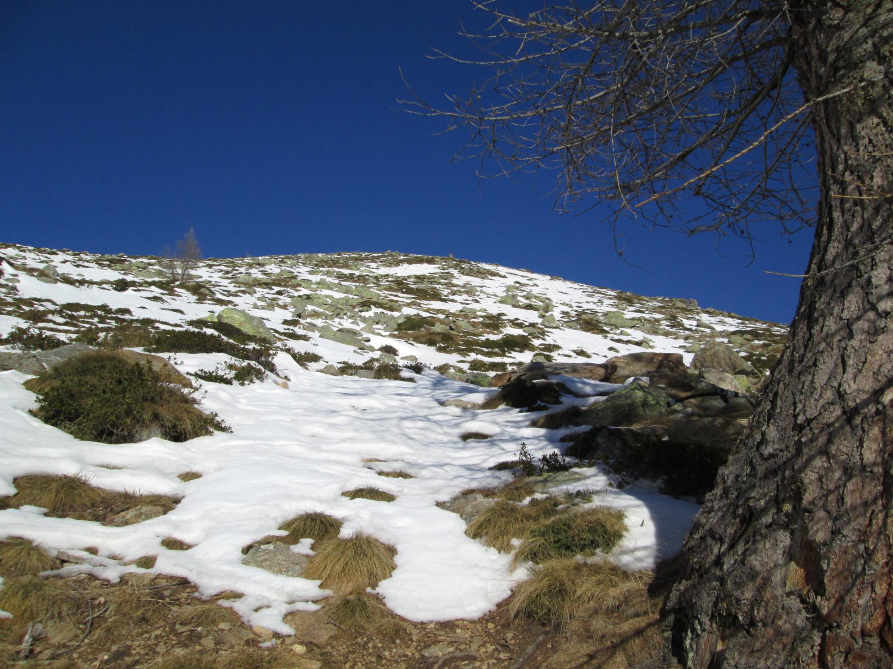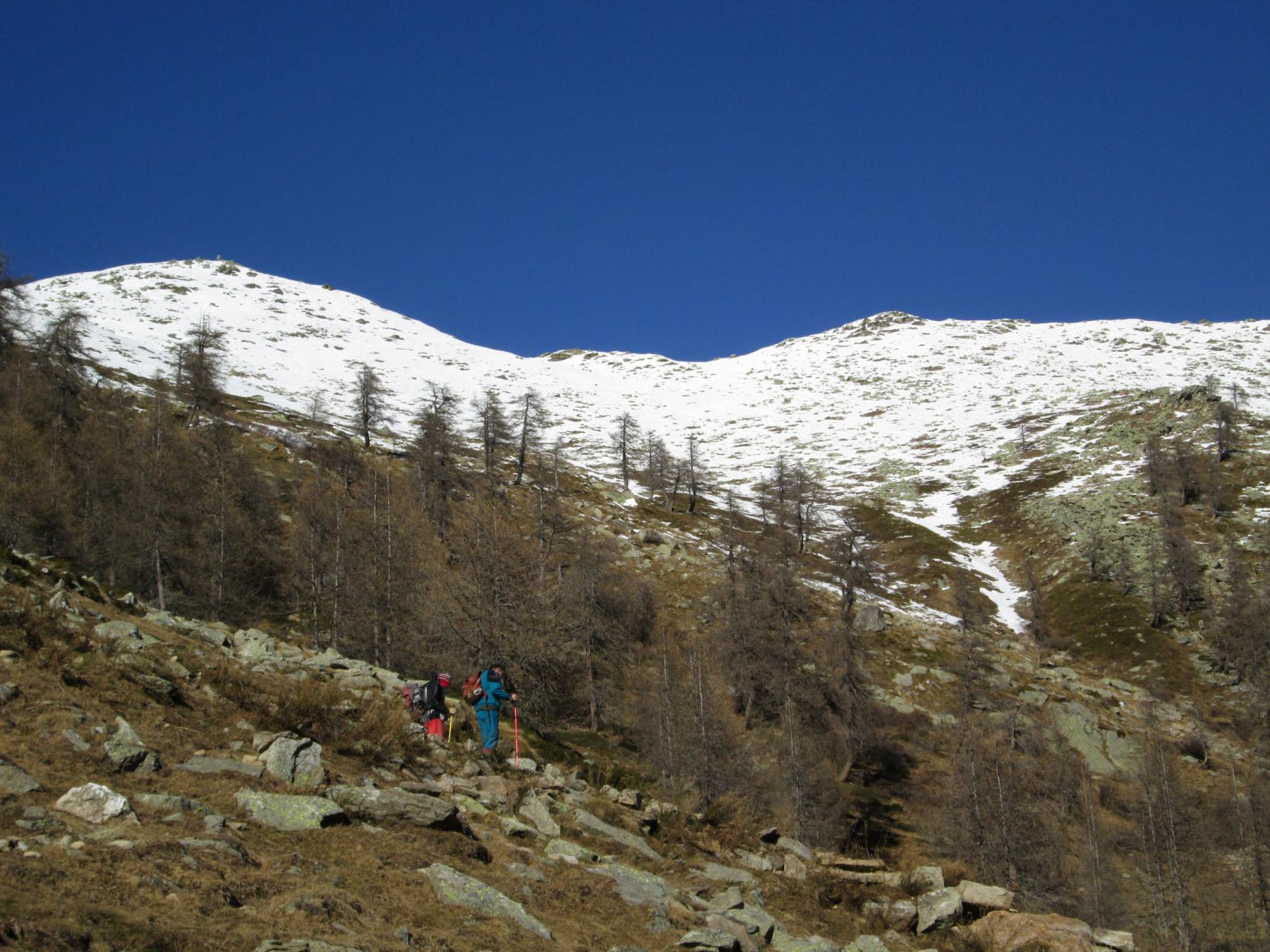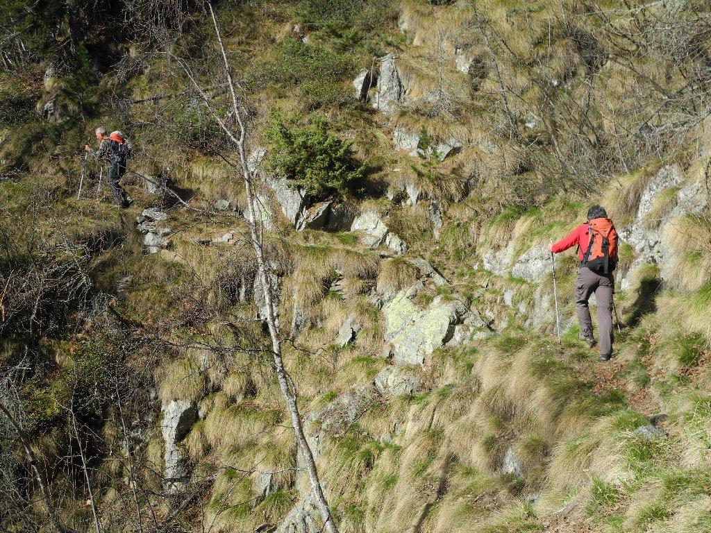 Qui la cartografia non indica più alcun sentiero, ma da poco è stato ripristinato un nuovo tratto che prosegue sempre in direzione sud est e a tratte sale decisamente tra bassa vegetazione e rododendri sino a raggiungere la radura (ed uscire dal bosco) appena sopra l’alpe Brenghia 1794m. (nel versante del Kiri).