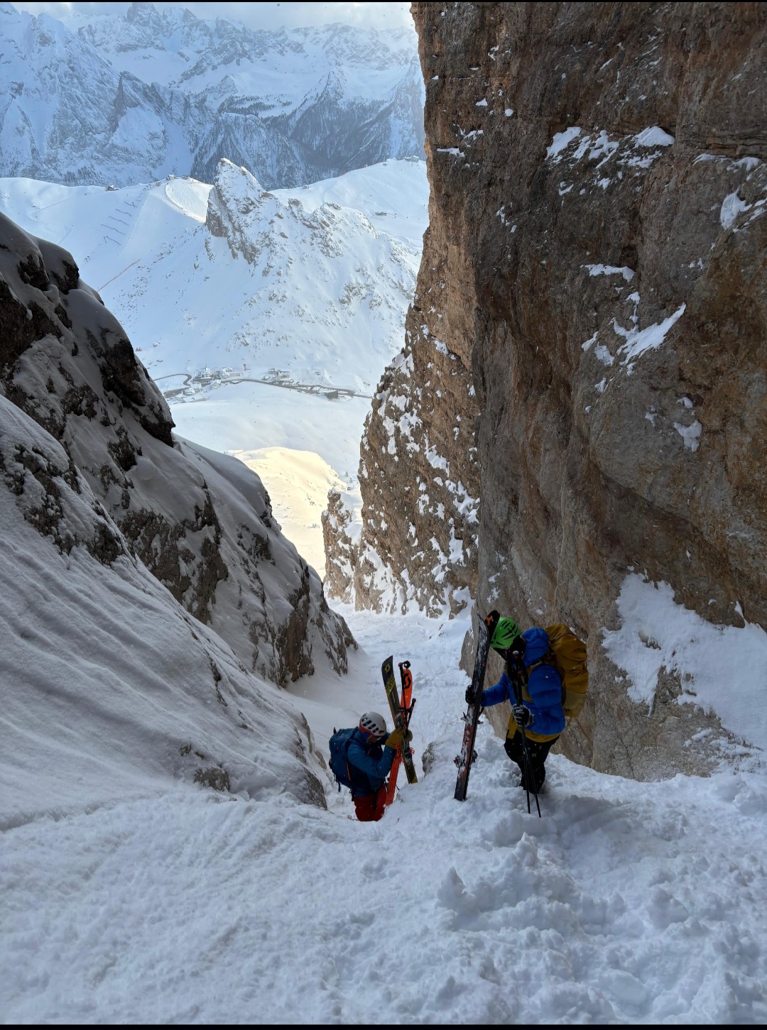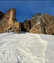 Il canale subito può essere ripido per via della cornice, ma subito dopo si attesta sui 40-45° consentendo una bellissima sciata fino a ricongiungersi all’itinerario classico della forcella Pordoi