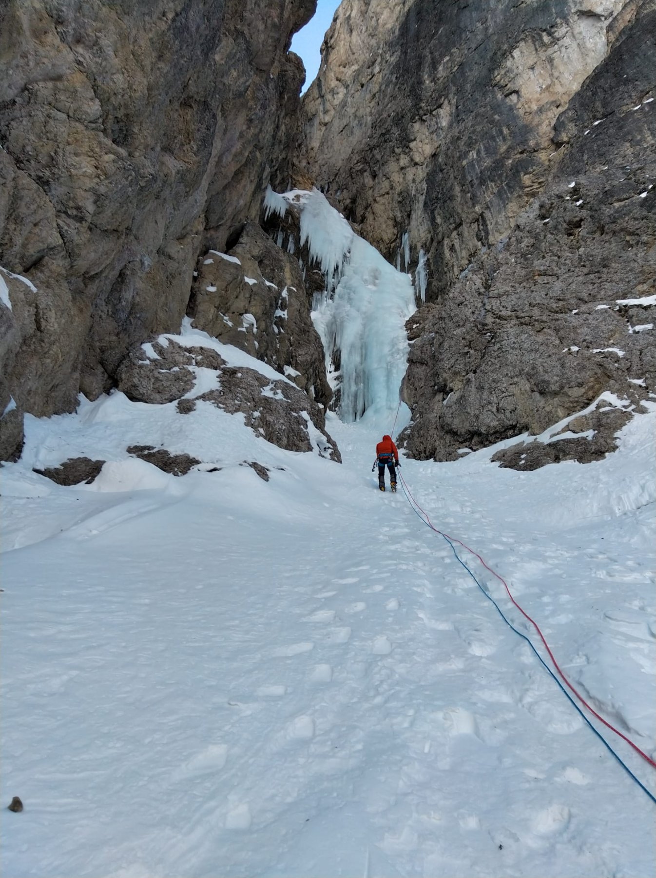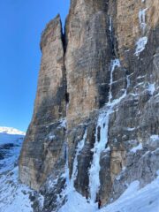 L1: 40m, 4+ Colata di 10m 80° poi si abbatte. Sosta su ghiaccio o friend.