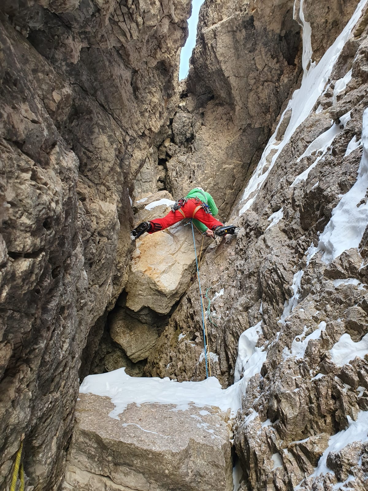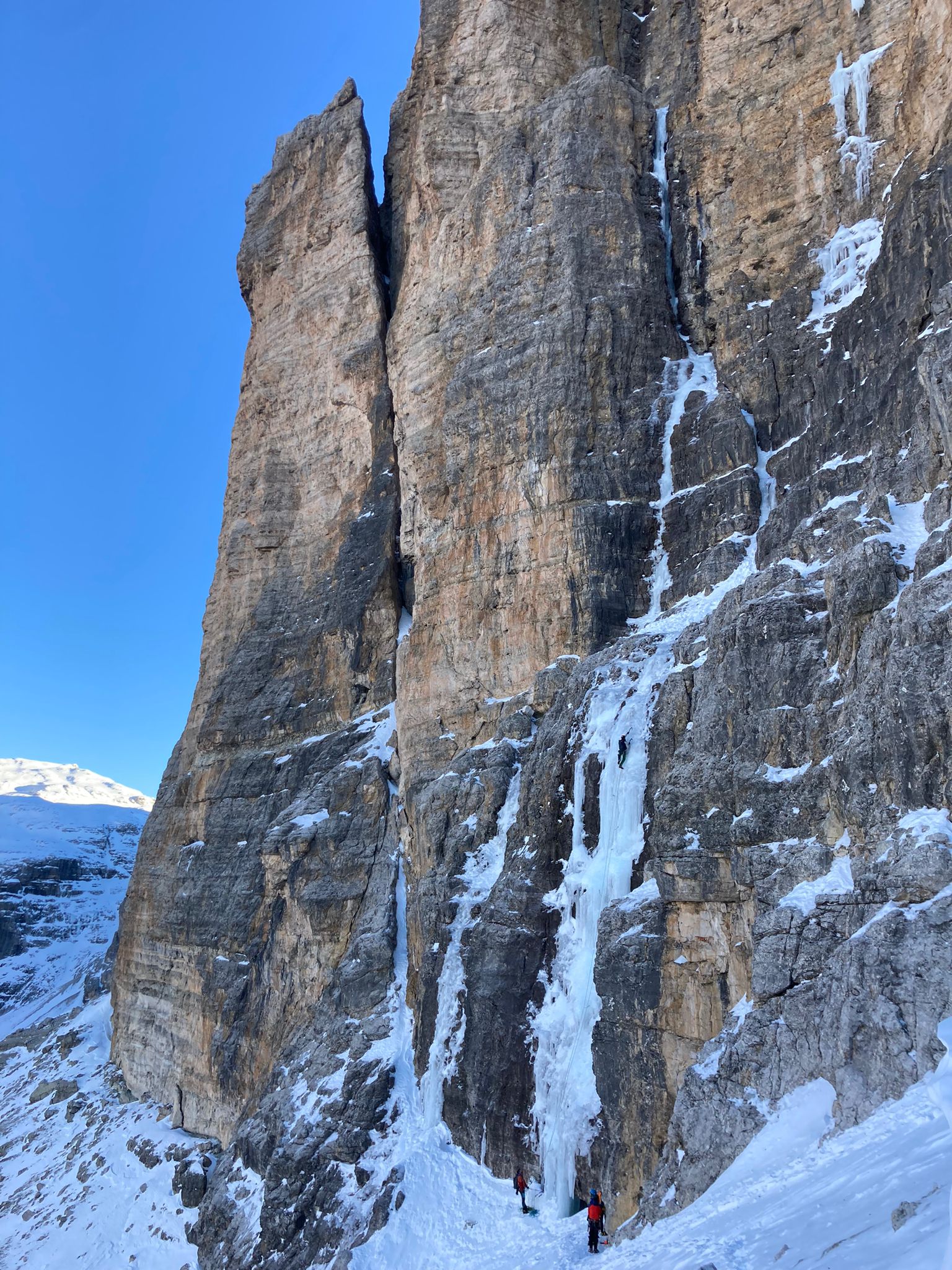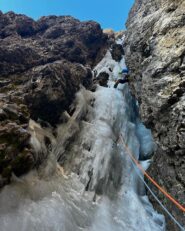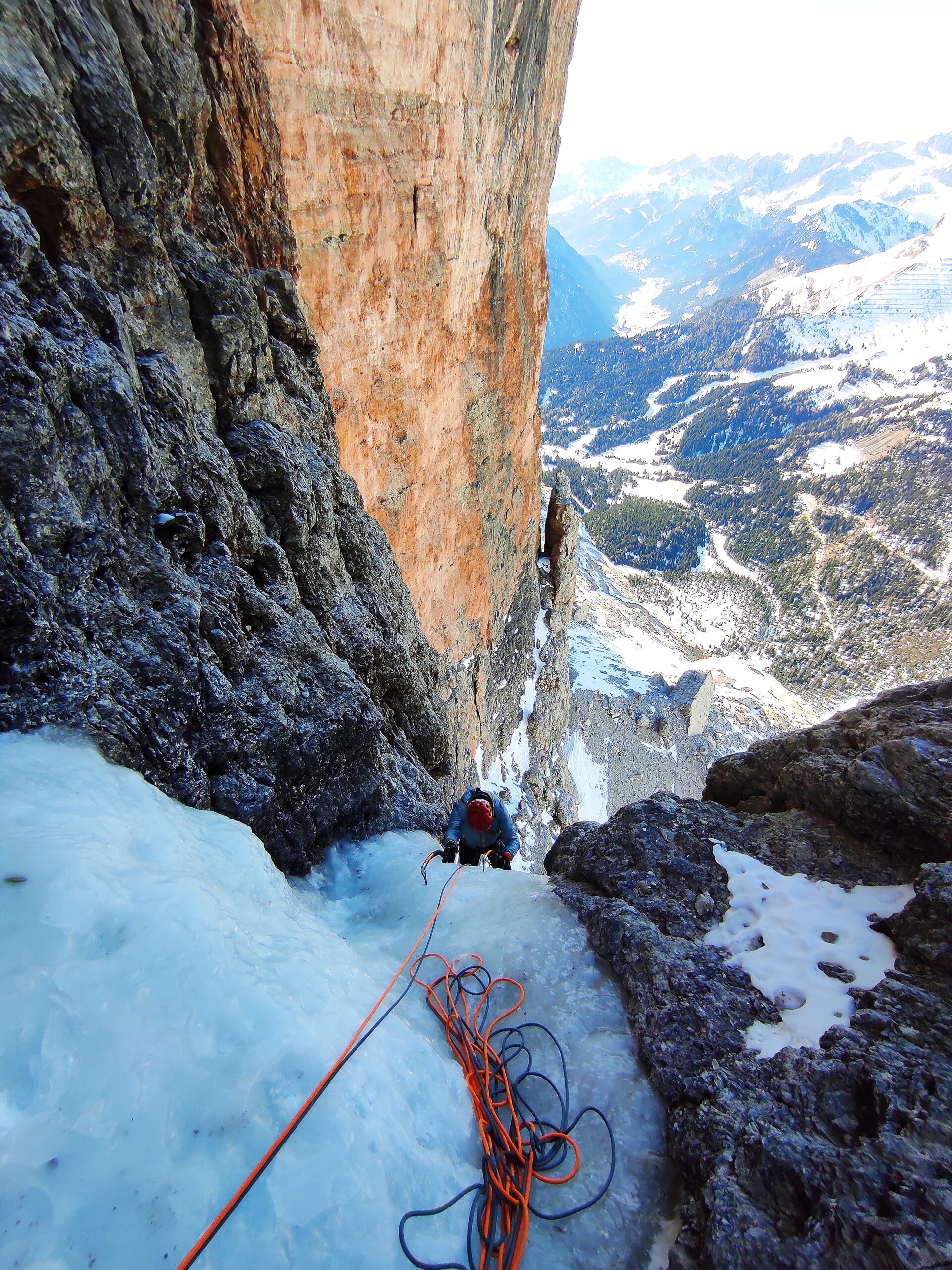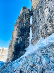 L3: 50m, 5 bellissimo tiro in goulotte incassata. Sosta su clessidra o ghiaccio.