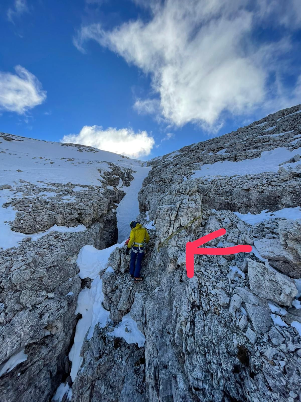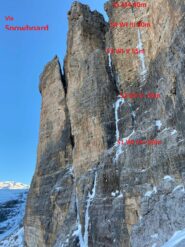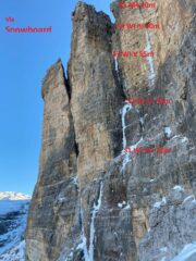 L5: 40m, M4, passaggio di roccia, infilarsi nel buco di sinistra, rinvenire allo snowboard che da il nome alla via e uscire. Sosta da attrezzare su spuntoni/fessure.