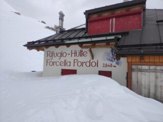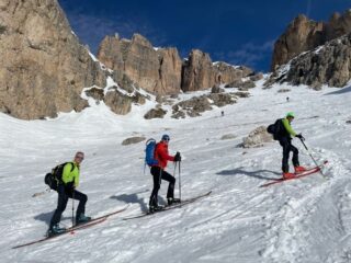 Saliti da Passo Pordoi con le pelli fino in forcella Pordoi. Indispensabili rampanti, suggeriti anche i ramponi per l’ultimo tratto. Attraversamento del Sella con nuvole e leggera nevicata, ma visibilità buona. Discesa Val Mezdi parte alta buona, parte sotto neve primaverile.