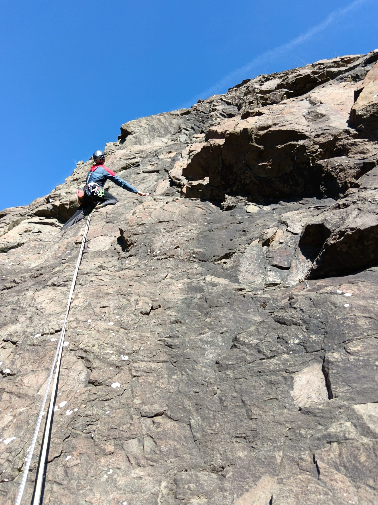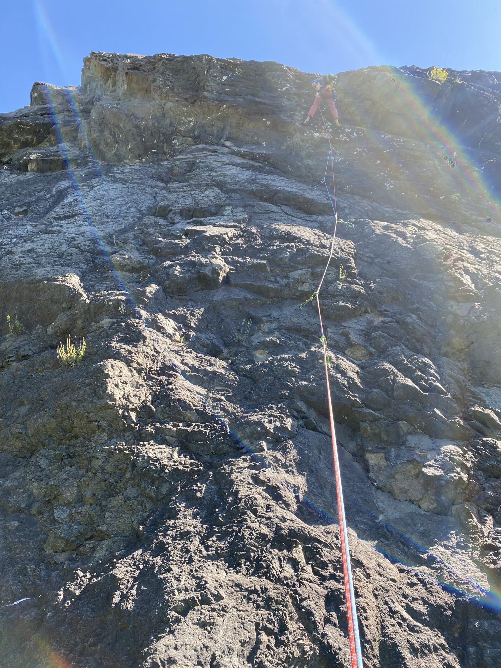 - In calata in doppia sulla verticale fronte parete più a dx rispetto all’uscita della via, 3 calate da circa 40m ciascuna.