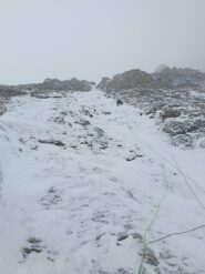 - L1 pendio facile seguito da una strozzatura che porta sotto l’inizio delle difficoltà. Sosta 1 su chiodi.