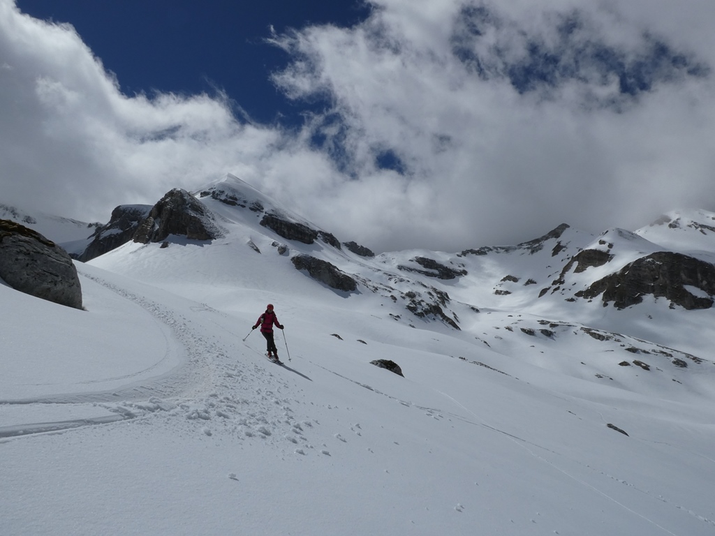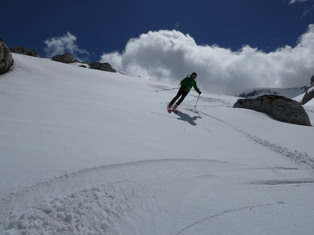 Saliti alla Sella dell’Aquila sci ai piedi, superato il Sassone, a motivo del forte vento e dell’affollamento abbiamo rinunciato alla traversata alta scendendo in piena solitudine questo bellissimo itinerario su ottima neve, farinella pressata dal vento ottimamente sciabile nella parte alta e trasformata più in basso.