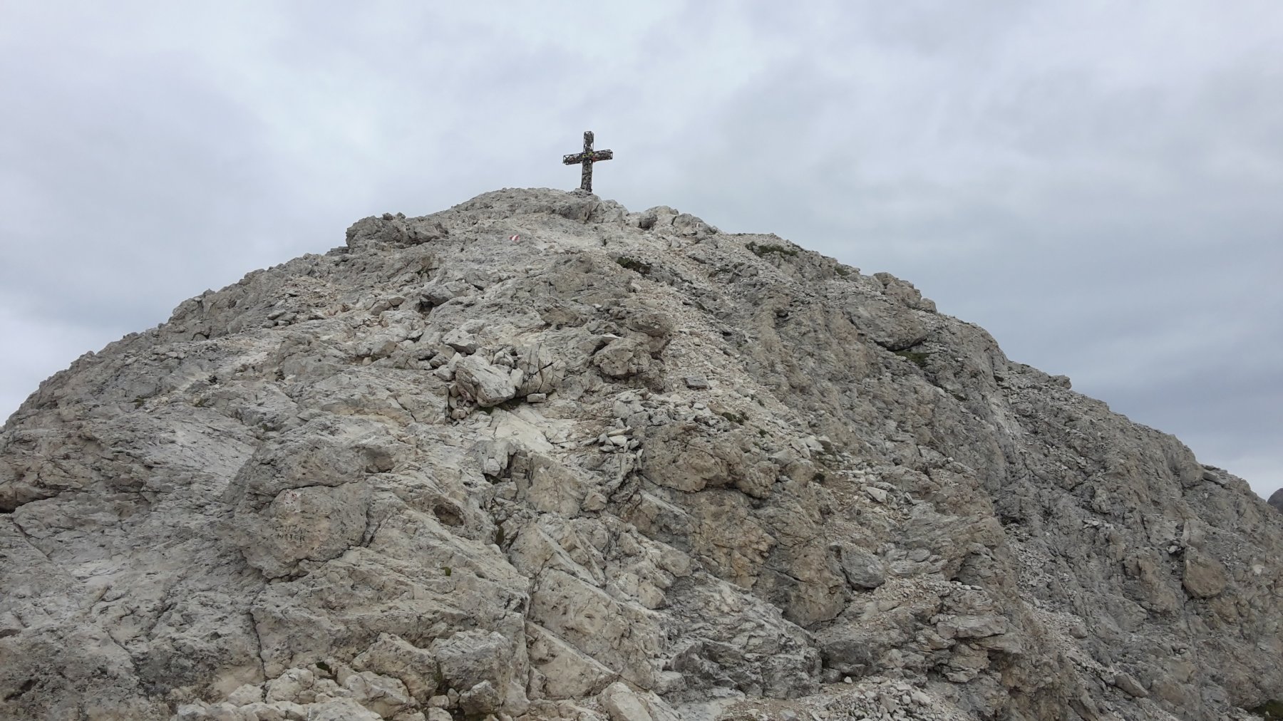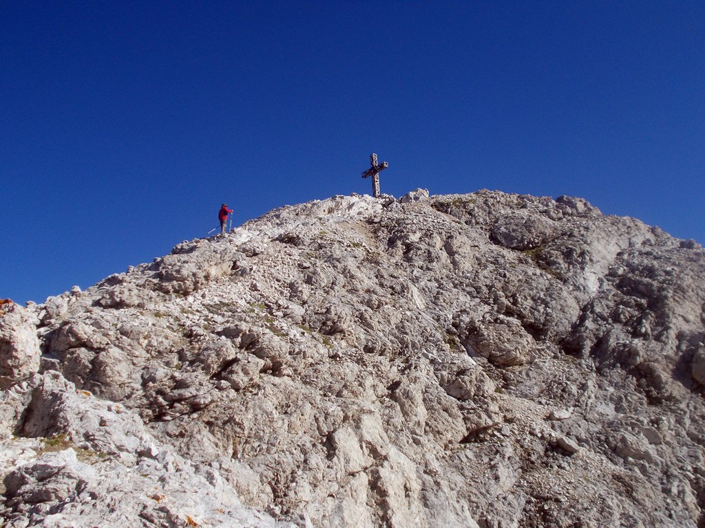 La traccia sempre piuttosto marcata si snoda nel versante S-SO della montagna, e si sposta gradualmente verso destra, tra zone di sentiero ghiaioso alternato a brevi placche rocciose ben gradinate. Terminato il pendio si esce ad una selletta dove arriva dal versante opposto la via Ferrata Schuster, e da qui in pochi passi percorrendo la breve crestina rocciosa si giunge alla maestosa croce di vetta del Sassopiatto.