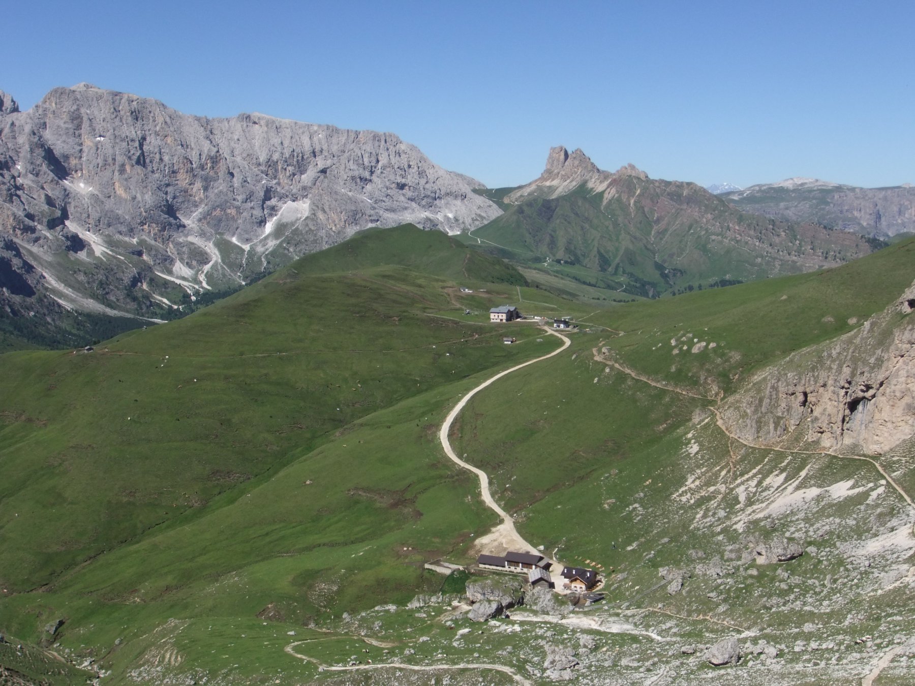 Dal parcheggio sotto il Passo Sella 2244 m, lato Val Gardena si segue la sterrata che poi diventa cementata che inizia nei pressi del Rifugio Valentini, e in breve raggiunge il Col Rodella 2318 m (dove arriva la seggiovia da Campitello di Fassa). Seguire segnavia 557-4 lungo la sterrata in discesa che poco dopo termina nei pressi del Rifugio Federico Augusto; inizia così il bel sentiero facente parte del giro del Sassopiatto e Sassolungo; Con alcuni saliscendi si si tocca il Rifugio Sandro Pertini 2300 m, e senza guadagnare molta quota, ancora con varie brevi discese, si arriva ad un promontorio panoramico che si affaccia sulla conca della Malga del Sassopiatto e più distante il Rifugio Sassopiatto.