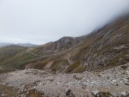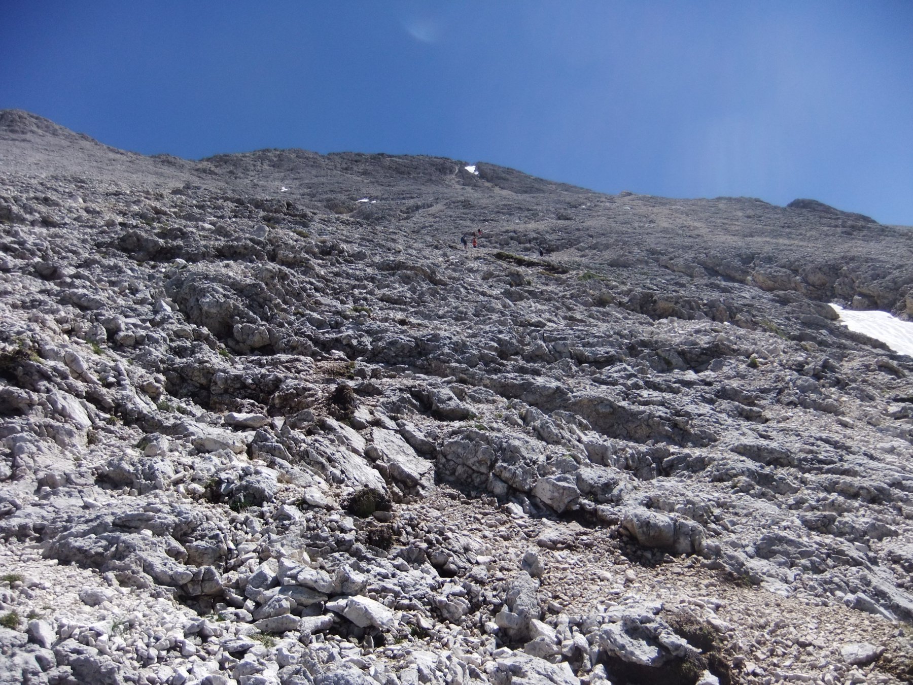Qui occorre scendere ripidamente circa 50 m di dislivello, fino a incontrare un bivio: si tralascia ora il sentiero principale per il rifugio Sassopiatto, continuando a destra in salita con un lungo traverso sotto le prime propaggini del Sassopiatto. Al culmine del traverso si affronta un costone un po’ più ripido che adduce ad una graziosa conca prativa sotto la imponente parete sud-ovest del Sassopiatto. Raggiunta una sella a 2400 m, il sentiero segnalato da tacche di vernice bianco rosse, volge decisamente a destra iniziando una lunga serie di serpentine, inizialmente su terreno erboso, poi via via completamente detritico e in parte roccioso. Da qui in poi la salita, nonostante i circa 500 m di dislivello da coprire, sarà rapida e molto diretta.