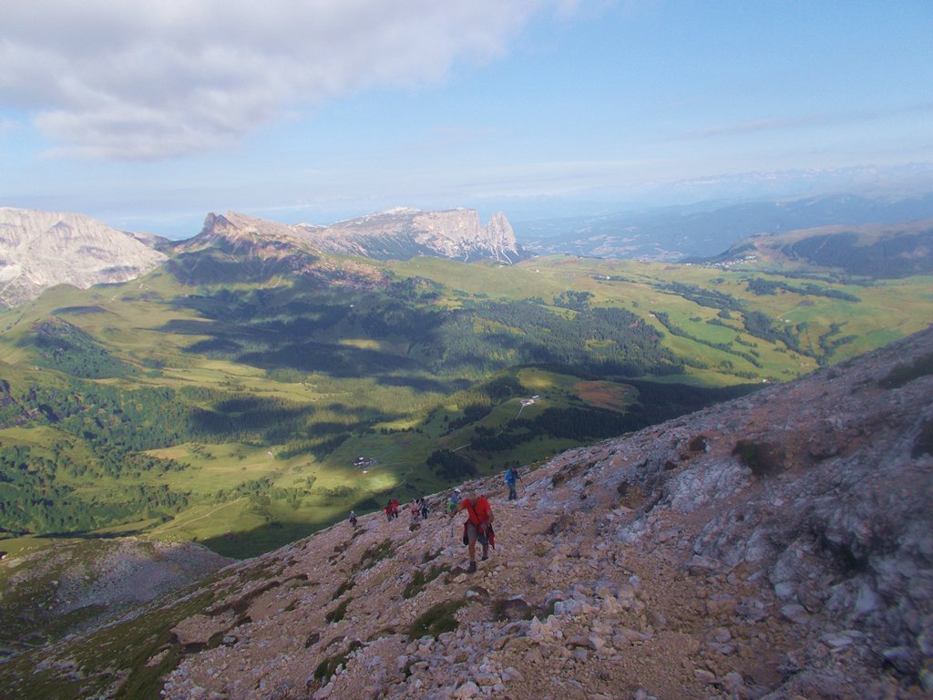 La salita al Sasso Piatto ,era prevista per ieri(Sabato,25) ,poi per vari motivi è stata rimandata a oggi,faceva parte della gita organizzata dal Cai Mondovi ,con partenza dal Passo Sella ,pernottamento al rif.Sasso Piatto e proseguimento per il Rifugio Alpe di Tires,poi trasferimento al rif.Bolzano e discesa a Fiè allo Sciliar.Inutile dire della spettacolarità e della bellezza di queste montagne ,che ormai conosciamo ,e che ogni anno ci portano a fare un’escursione in luoghi sempre diversi.Anche quest’anno siamo stati fortunati,e nonostante le non rosee previsioni meteo siamo riusciti a portare a termine l’escursione con successo,la pioggia è caduta quando ormai eravamo nel rifugio .Del gruppo composto da 31 persone,in 18 abbiamo raggiunto la cima ,in circa un’ora e 30.Altri escursionisti salivano quando noi stavamo già scendendo.un saluto a tutto il gruppo e in particolare a Pierre e Fausto,i capigita, e Luigina ,di Belluno ,da qualche anno nostra accompagnatrice nelle Dolomiti