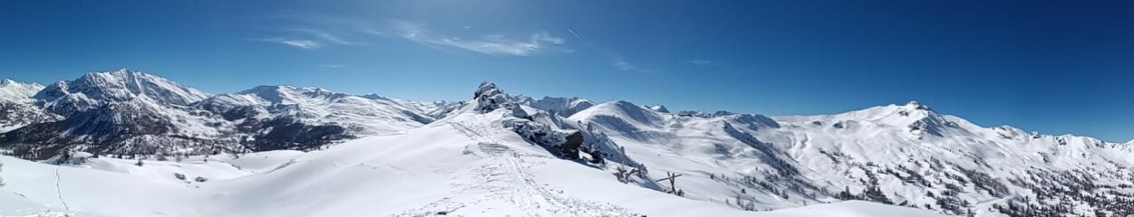 Tutto bianco! Super traccia fin quasi in vetta e poi l’abbiamo sistemata noi. Pendii di discesa perfetti, fino alla strada della Mautino. Diverse persone in giro.Fournier affollato, vallone della Dormilleuse tracciato. Qualche rumore di elicottero.