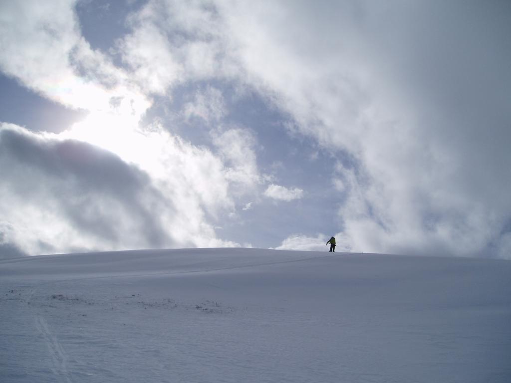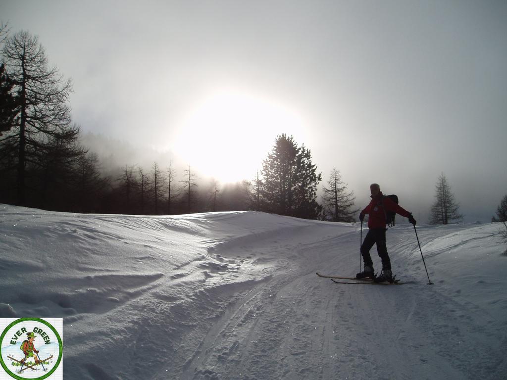 Neve recente e farinosa in alto con tratti di crosta portante dove il vento aveva spazzato la fresca. In basso la stradina è praticamente una pista.
