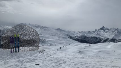 Saliti dal sentiero dei forestali con neve portante, dalla Mautino crosta portante che non aveva ancora mollato alle 11 circa a causa del cielo velato, ci siamo fermati alla sfera mirage, molte tracce di motoslitte in zona e elicottero che girava in zona Dormillouse