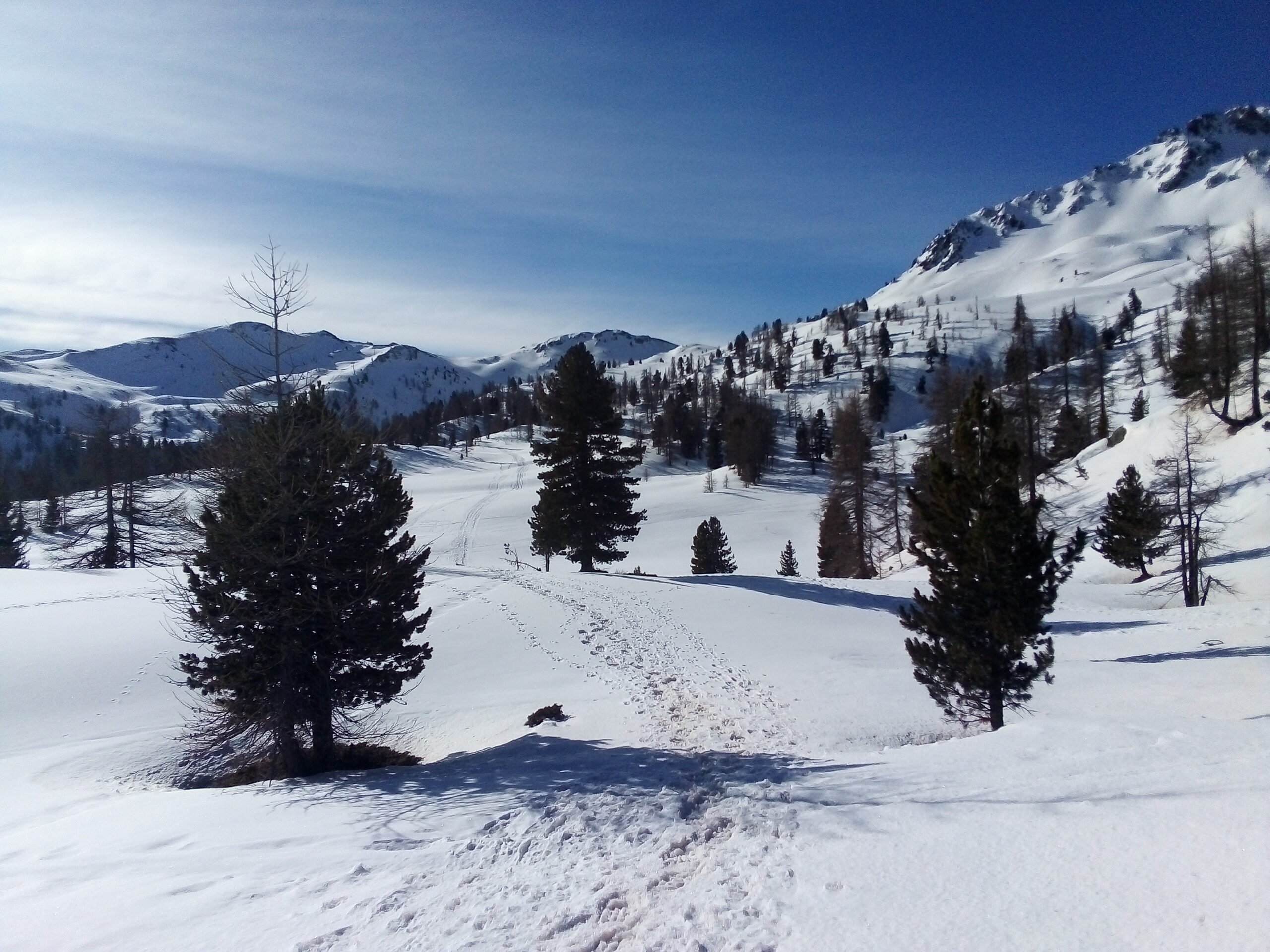 Dopo un primo tratto sulla pista verso la capanna Gimont ho preso la stradina che le passa sopra sulla destra e poi ho seguito il bellissimo sentiero alto con le indicazioni escursionistiche per il col Saurel (a proposito, ma questo passo non è quello a dx della seggiovia, cioé a ovest della cima Saurel, a differenza di ciò che par di capire leggendo l’itinerario?). Per la solidità della neve ho dovuto calzare le racchette solo sull’ultimo pendio sotto il colle. Dal col Saurel, dopo una capatina per cresta al col Gimont, sono salito alla cima e poi disceso verso nord. Alla Costa la Luna ho proseguito prima lungo la stradina e poi su un tratto di sentiero in cresta fino agli impianti di colle Bercia. Da lì, sceso rapidamente alla capanna Gimont.