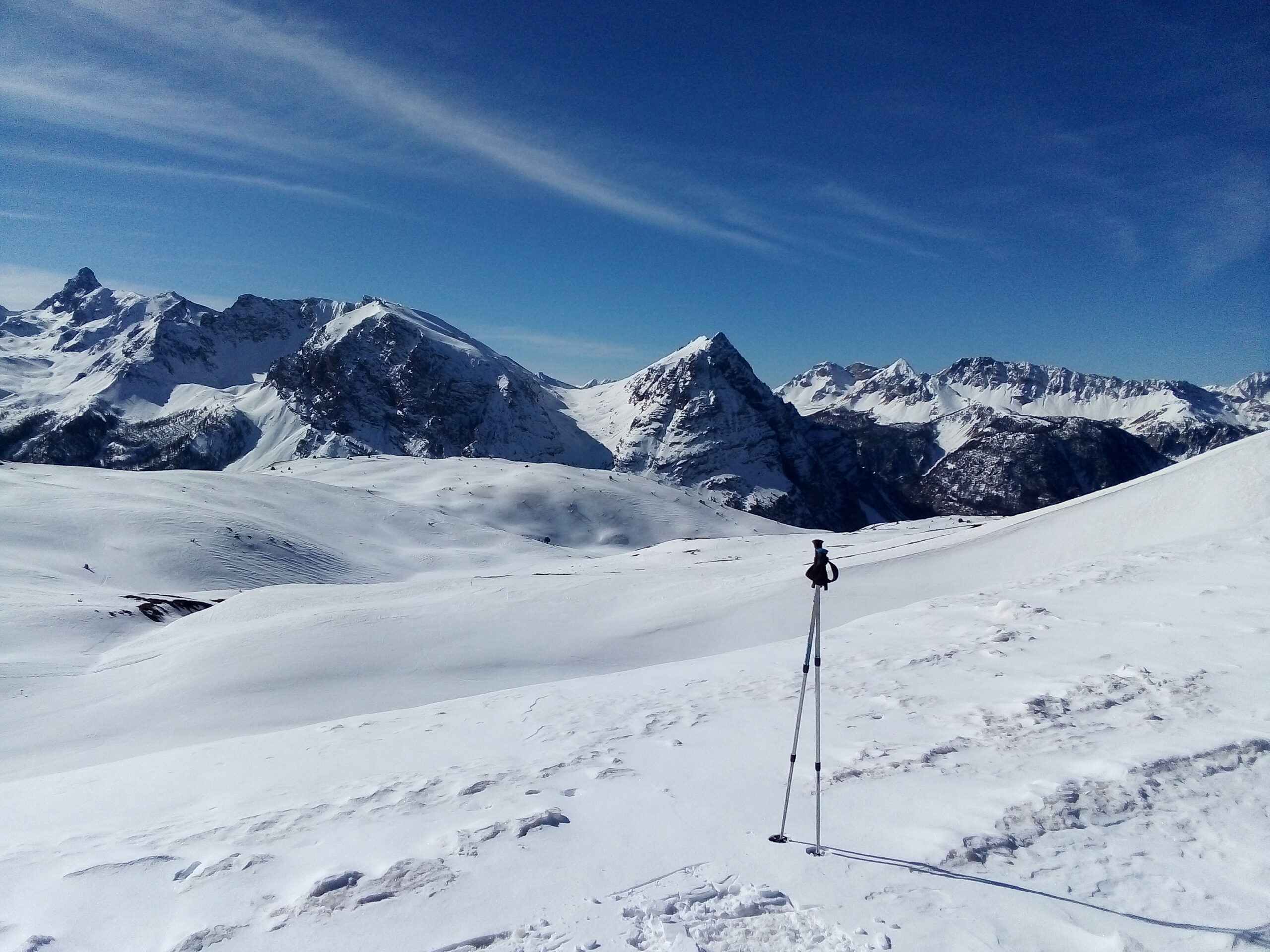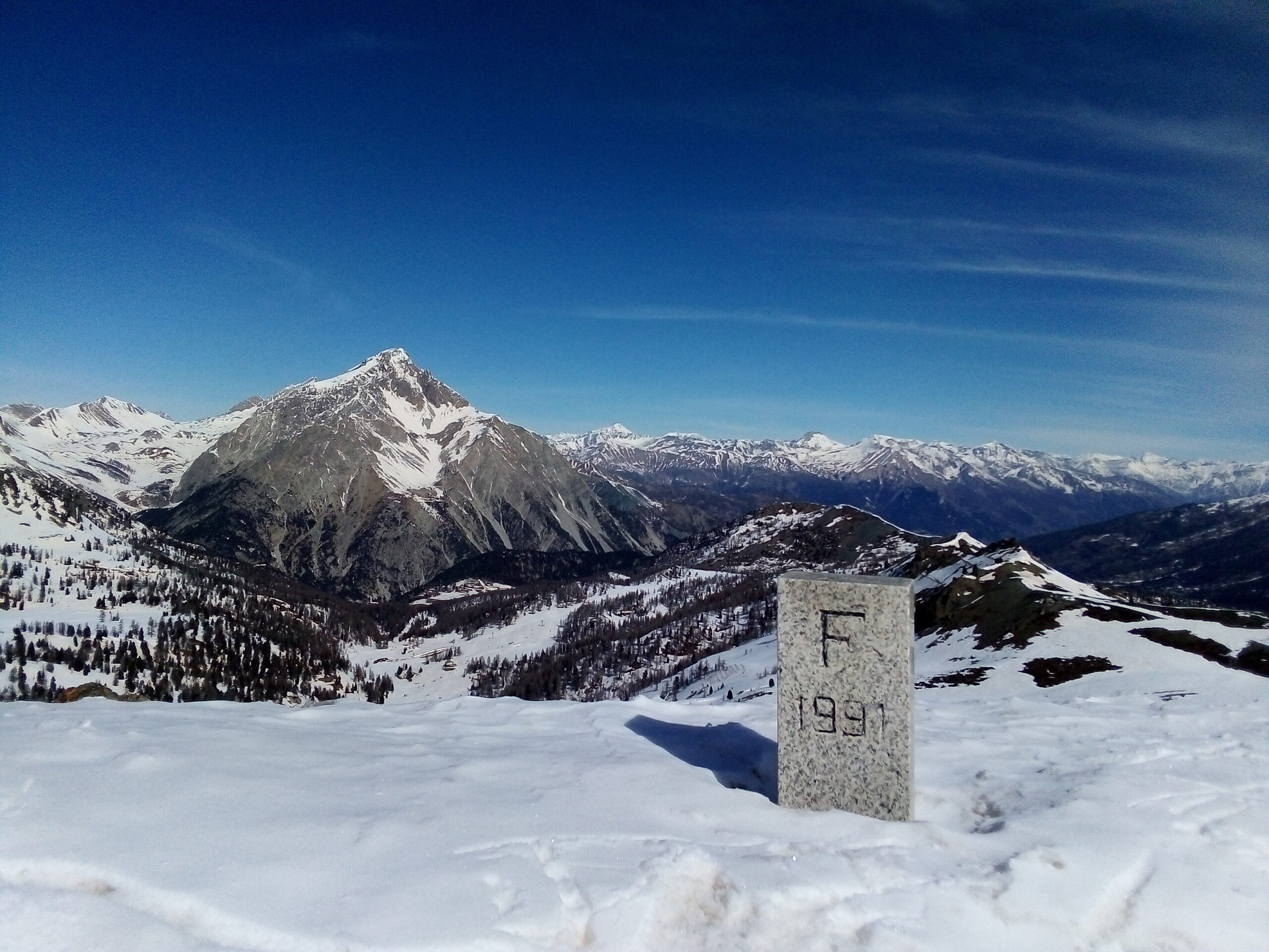 Partito da Claviere alle 8.20, in cima qualche minuto dopo le 11.00 e dopo la diversione al col Gimont. A impianti chiusi, incontrato solo qualche sciatore e un gruppo di escursionisti con slitte al traino. Una bella giornata. In ricordo dei migranti che, quest’inverno, hanno tentato di entrare in Francia passando dal col Saurel per evitare i pattugliamenti di frontiera al Monginevro.