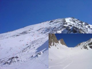 in foto le tracce di discesa dalla vetta e nella foto piccola dalla portiola