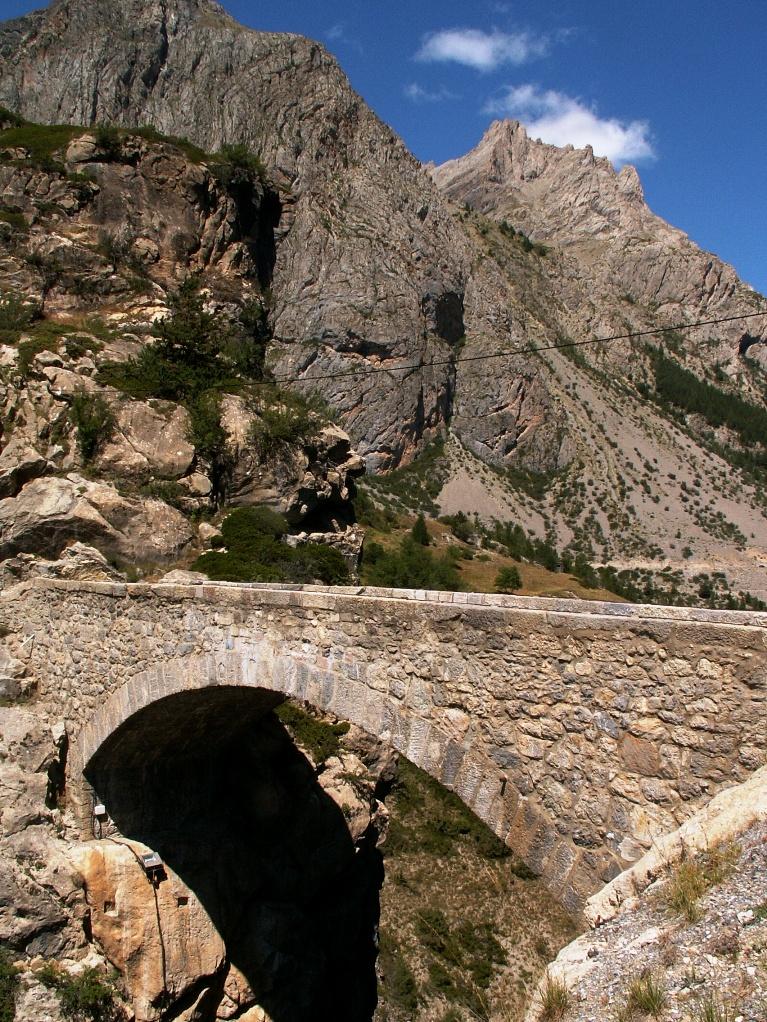 Discesa mai troppo ripida, arriviamo a Fouillouse m 1930 e km 27 circa dove troviamo la strada asfaltata che sale dal fondo valle, foto d’obbligo al bel paesino e via sull’asfalto (finalmente un po’ d’asfalto) fino al famoso Pont du Chatelet a m 1673 km 30 circa, anche qui foto di rito al ponte.