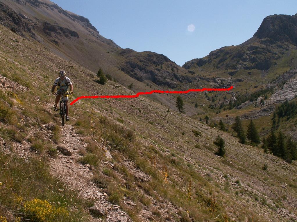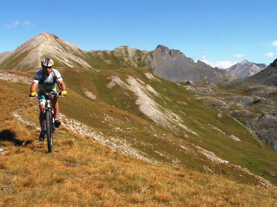 Dal Colle per sentiero si scende con il fondoschiena sulla bici fino al sottostante pianoro circa 150 m più in basso da dove, seguiamo il sentiero verso destra con indicazione per il Col de la Portiolette a 2680 m e km 10 .