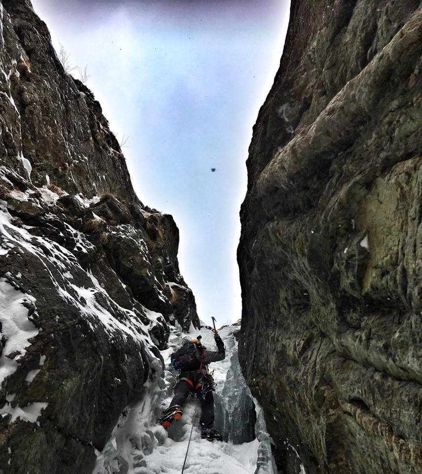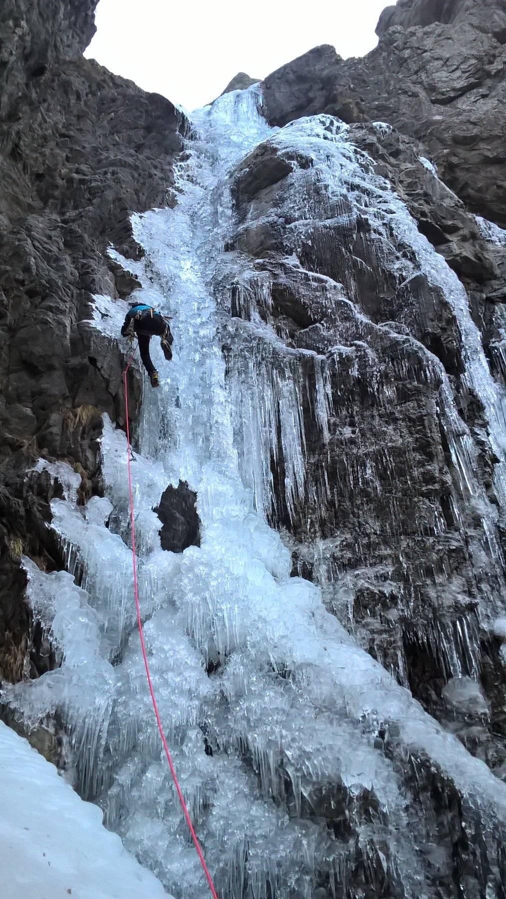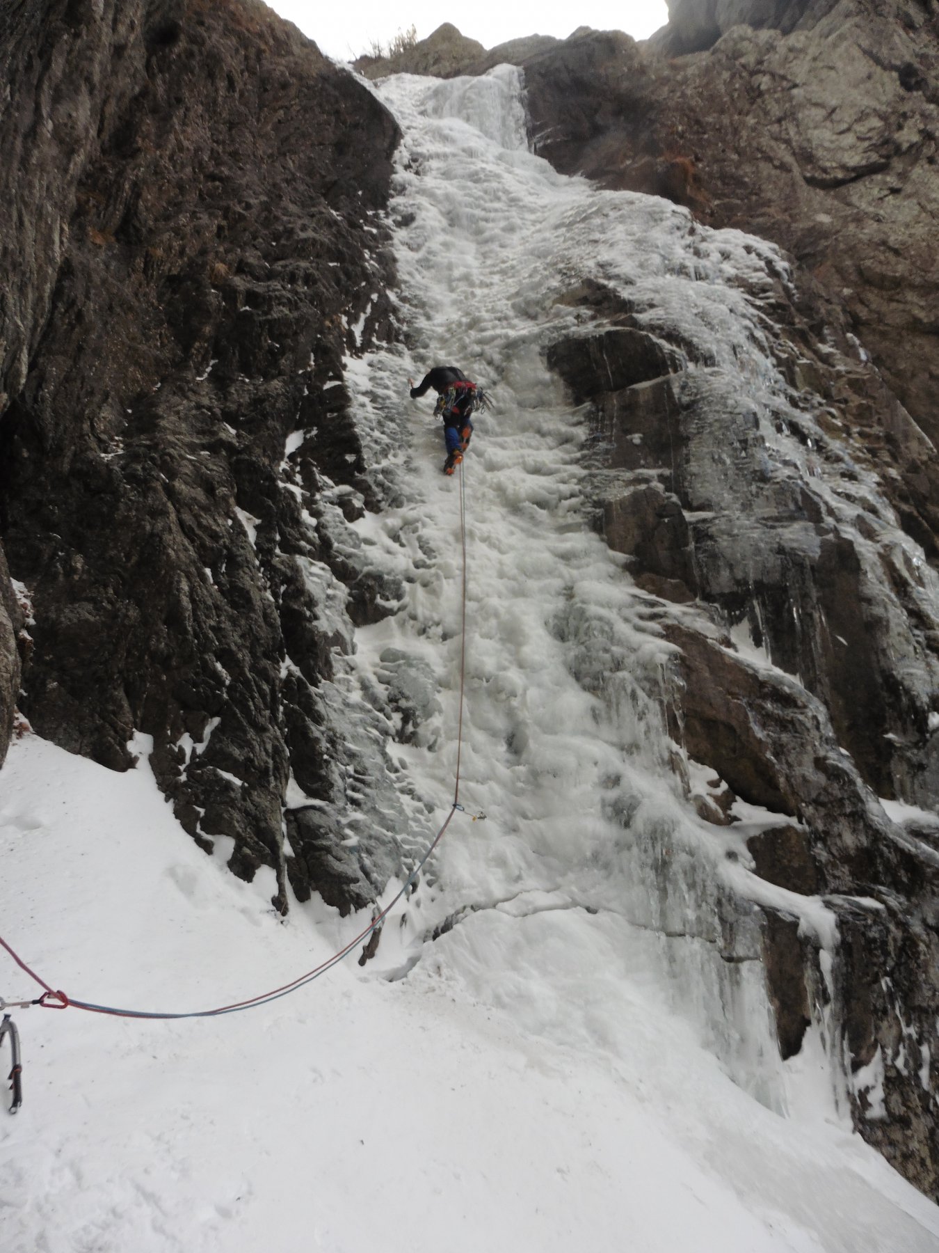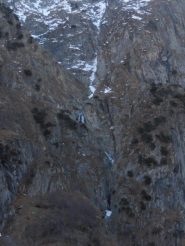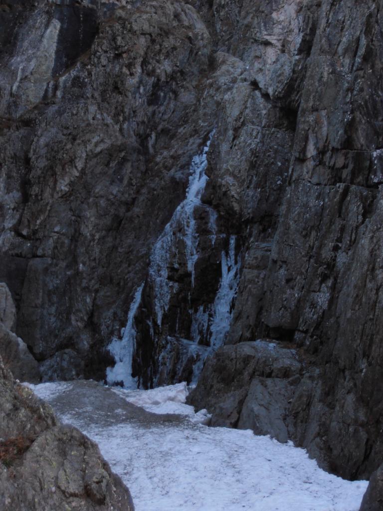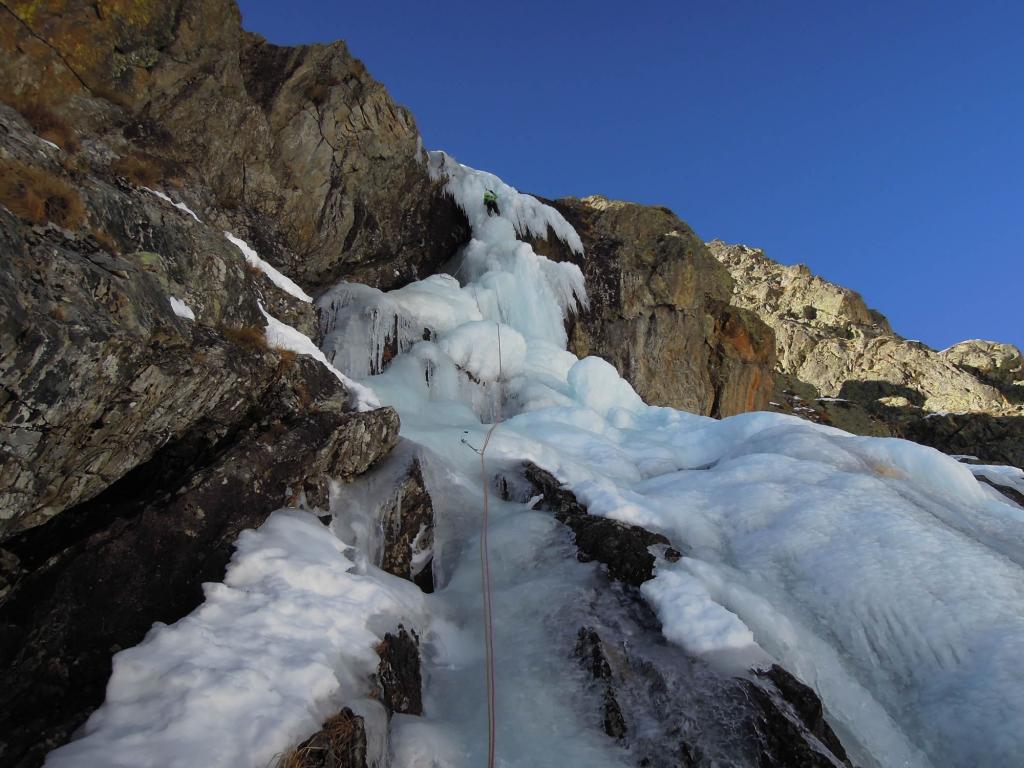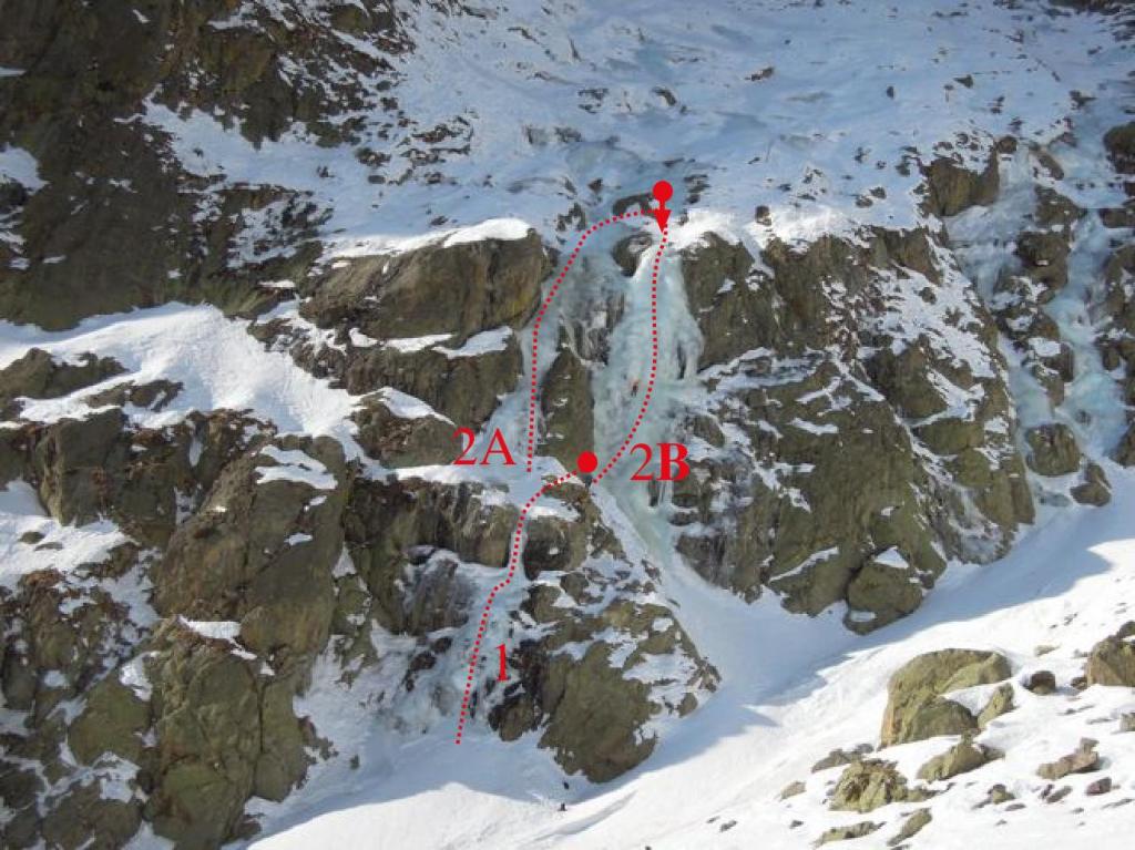 Risalire il conoide, attaccare il salto di ghiaccio di 35m a 80-85 gradi, seguono salti di ghiaccio intervallati da sezioni facili,nel settore centrale superare sue sezioni caratteristiche dentro a pareti incassate e anguste, dopo altri due tiri semplici portano al tiro finale : Bel salto di ghiaccio di 20 metri a 80-90-85 gradi (esso é ben visibile da san giacomo! Verificare le condizioni).