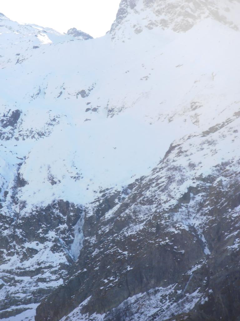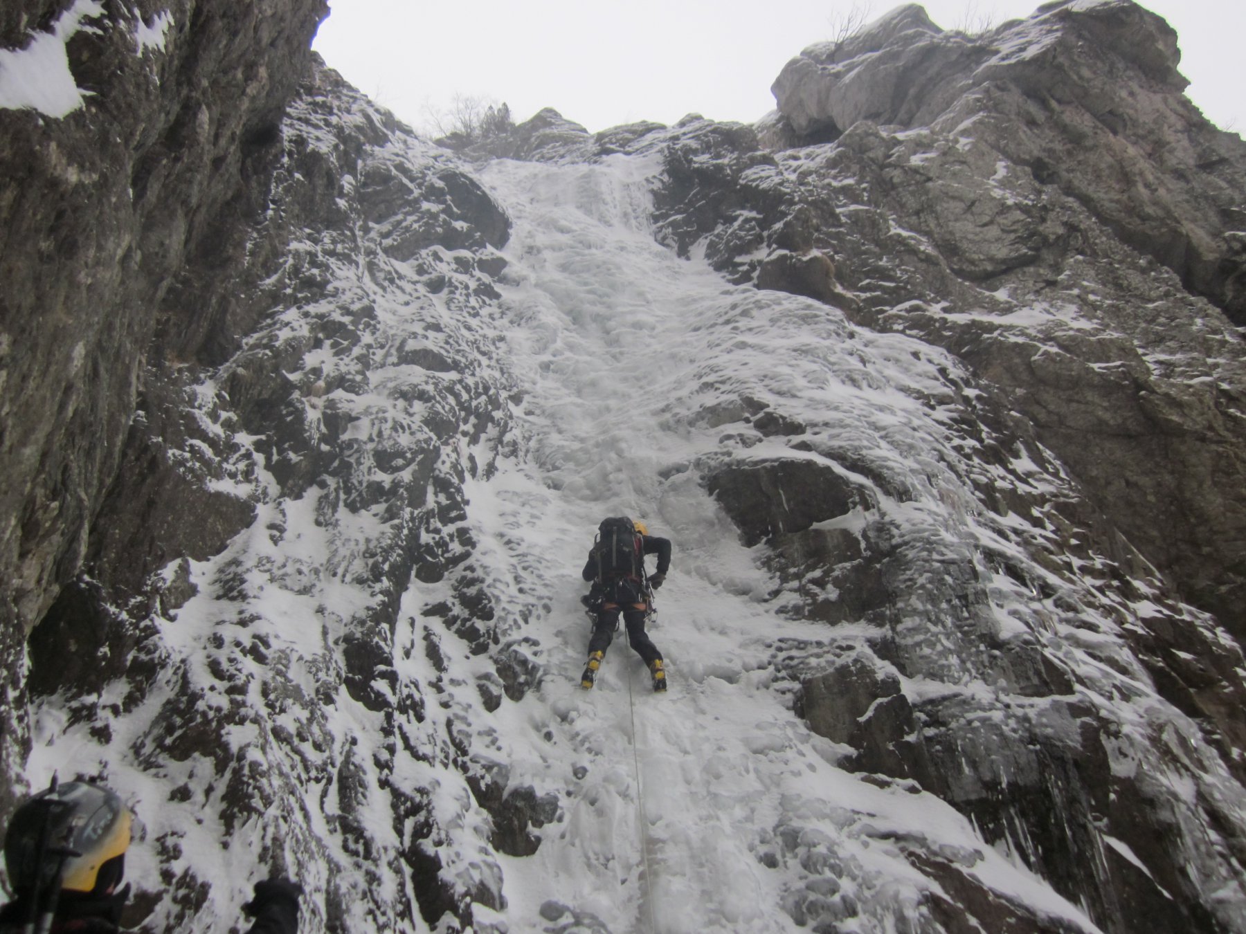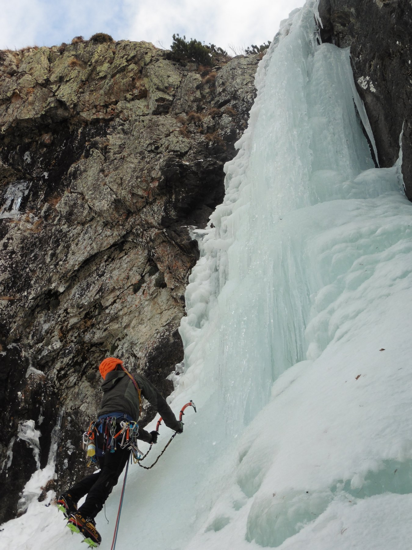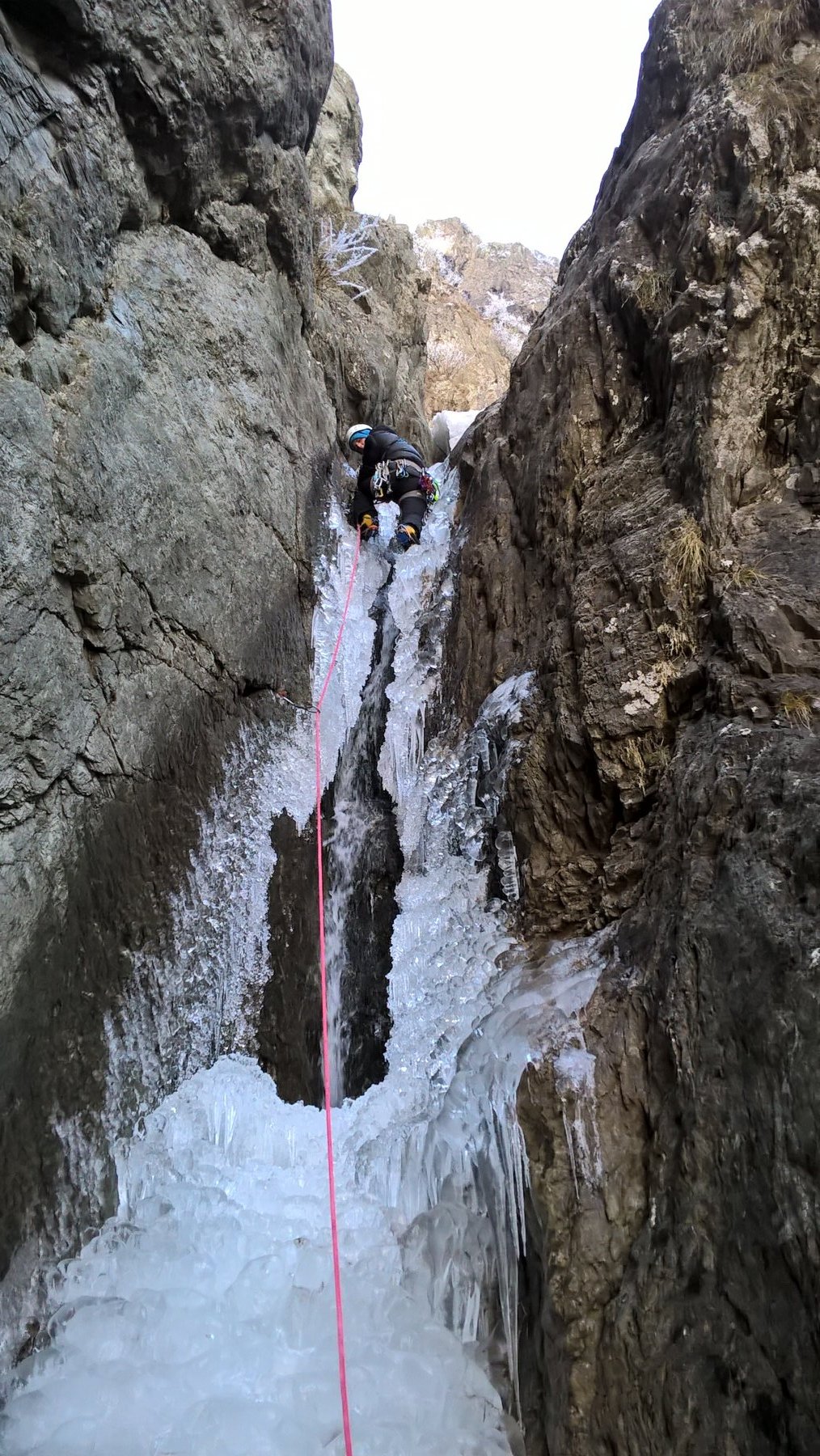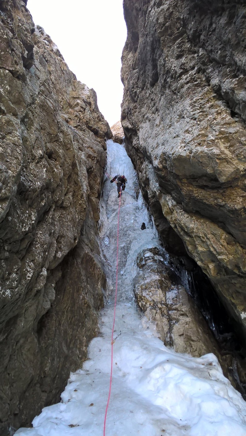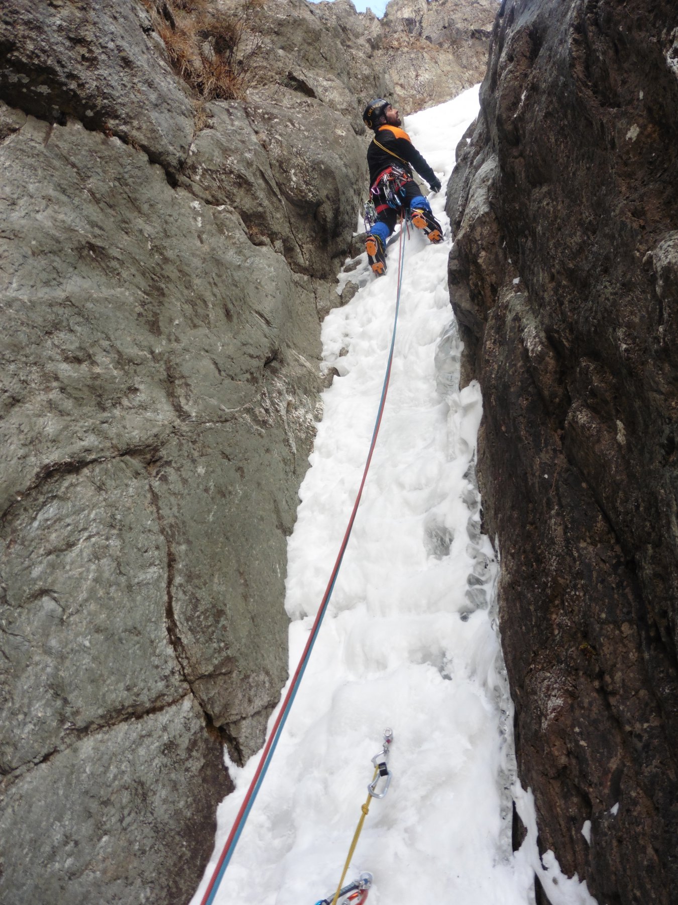 Risalire il conoide, attaccare il salto di ghiaccio di 35m a 80-85 gradi, seguono salti di ghiaccio intervallati da sezioni facili,nel settore centrale superare sue sezioni caratteristiche dentro a pareti incassate e anguste, dopo altri due tiri semplici portano al tiro finale : Bel salto di ghiaccio di 20 metri a 80-90-85 gradi (esso é ben visibile da san giacomo! Verificare le condizioni).