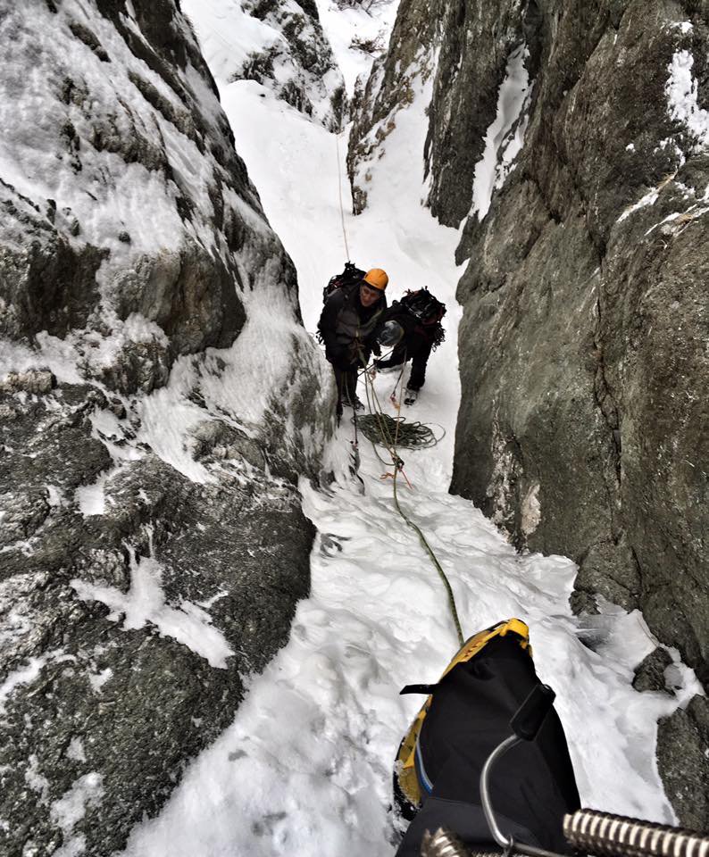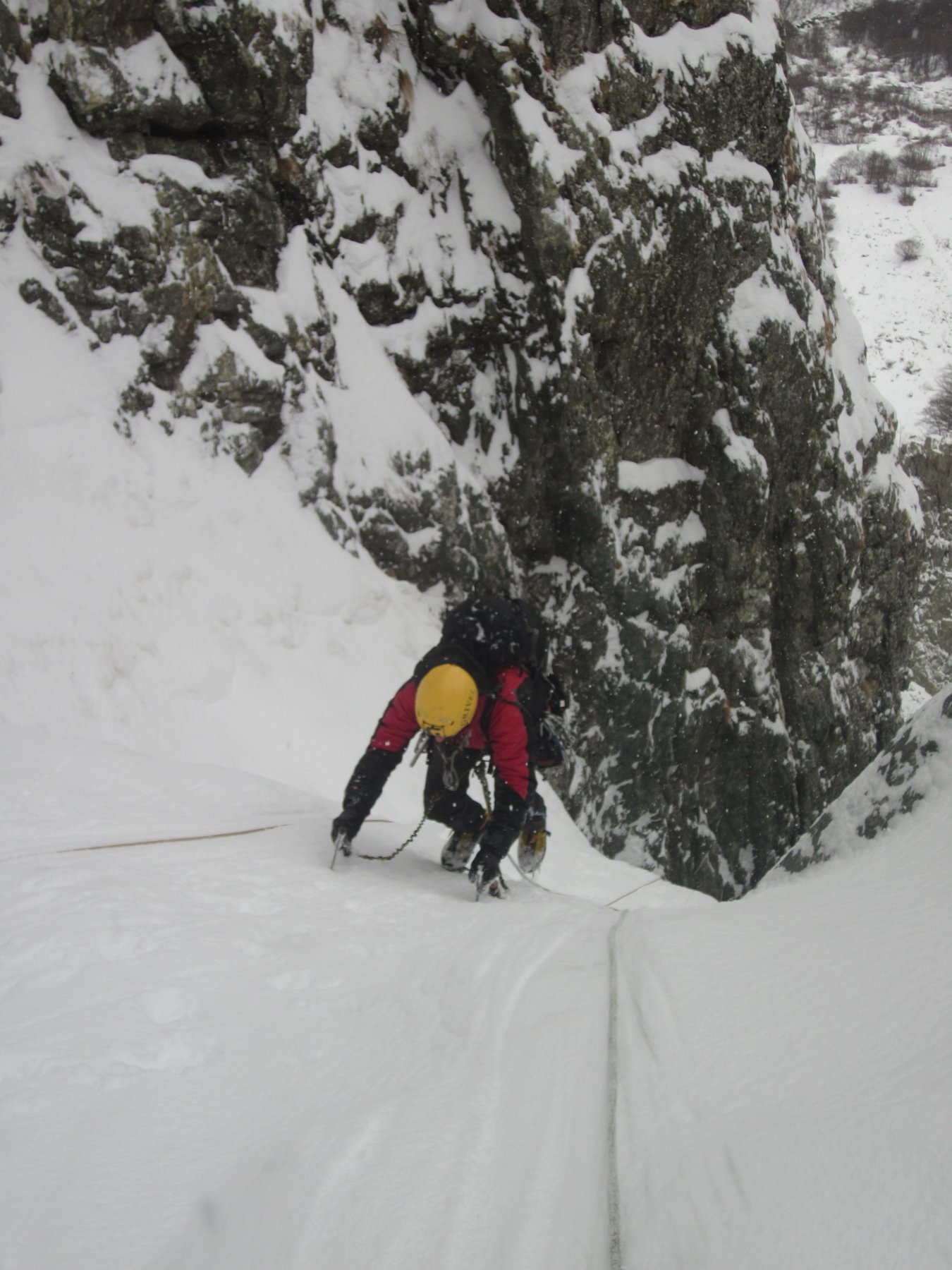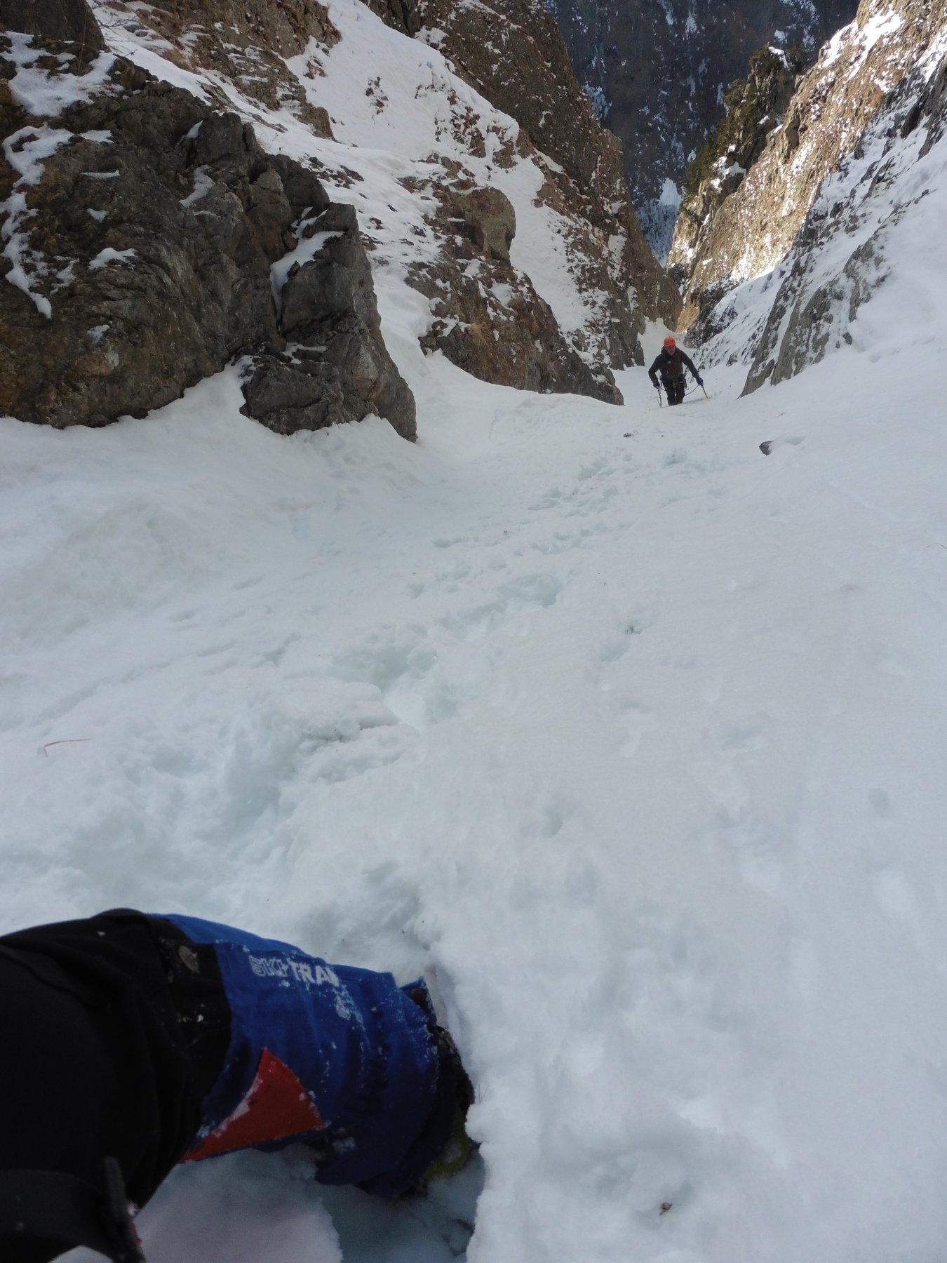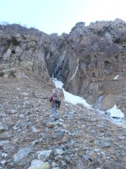 Si prosegue poi per canale nevoso per 450 metri, evitando le diramazioni di dx.