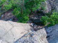 trasferimento a piedi, prima in salita poi (freccia visibile a dx) breve discesa ad aggirare un torrione, quindi risalita al torrione adiacente (fix visibile)