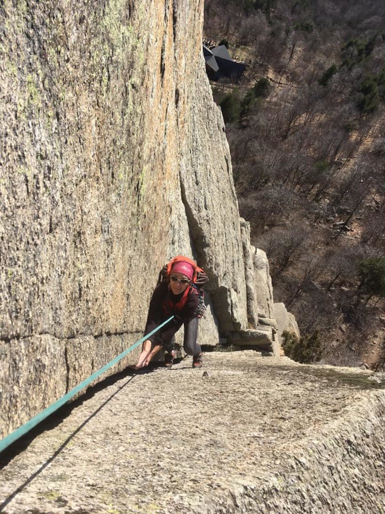 L.5 la meravigliosa dulfer a se per fare qualche foto sul passaggio più caratteristico di tutta la Rocca, da questa sosta senza slegarsi con 50 metri passando sul sentierino, e moschettonando un rinvio sulla cengetta che passa sotto gli Spigoli di dx e sx si arriva ai piedi del meraviglio Spigolo Bianciotto