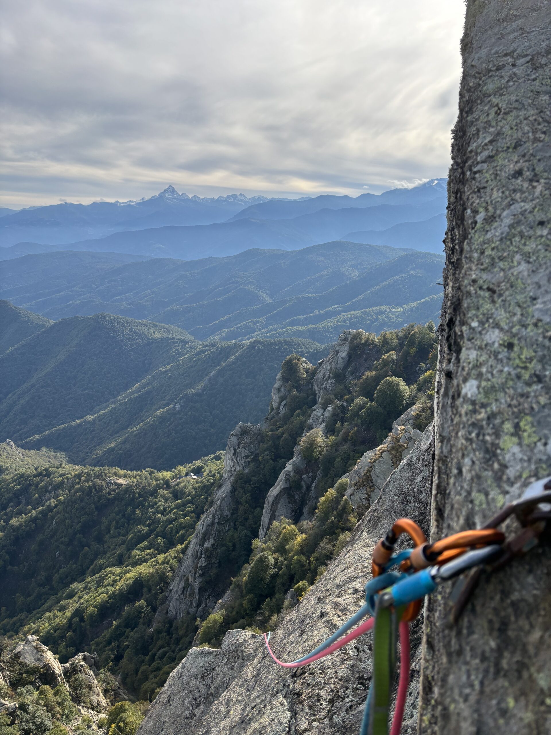 Chiodatura ottima, sopratutto nella parte alta, nonostante sia arrugginita non muove quasi nulla (sosta L5 il dado sarebbe da stringere). Ampia possibilità di concatenamento, noi abbiamo unito L1-L2, L3-L4, L6-L7, L8-L9, L10-L11, L13-L14, necessari rinvii allungabili, integrazione non necessaria. Abbiamo usato 2 mezze da 60 m.
