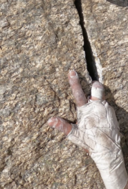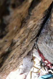 Partenza strapiombante su prese buone poi si attacca la fessura, a tratti larga e svasata. Uscita spesso sporca da non sottovalutare.