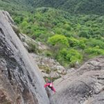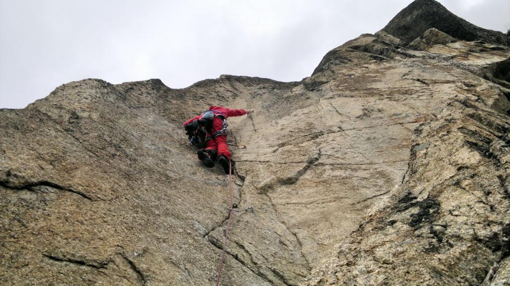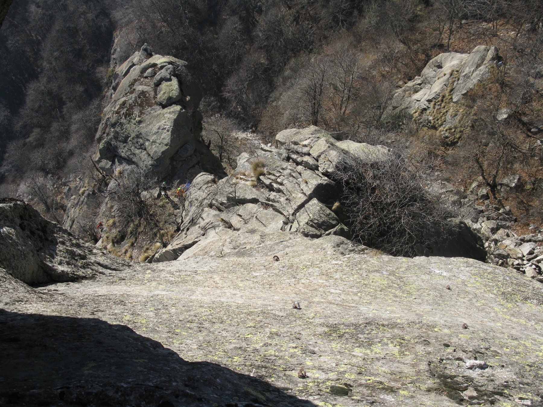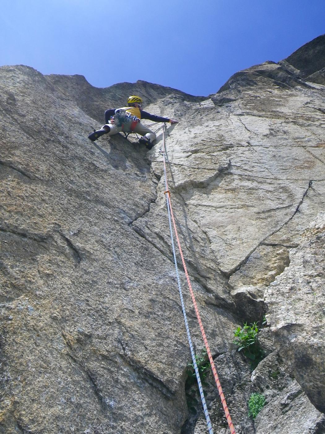 - V tiro traverso esposto poi singolo duro per superare uno strapiombino, poi muretto verticale delicato 5c/6a