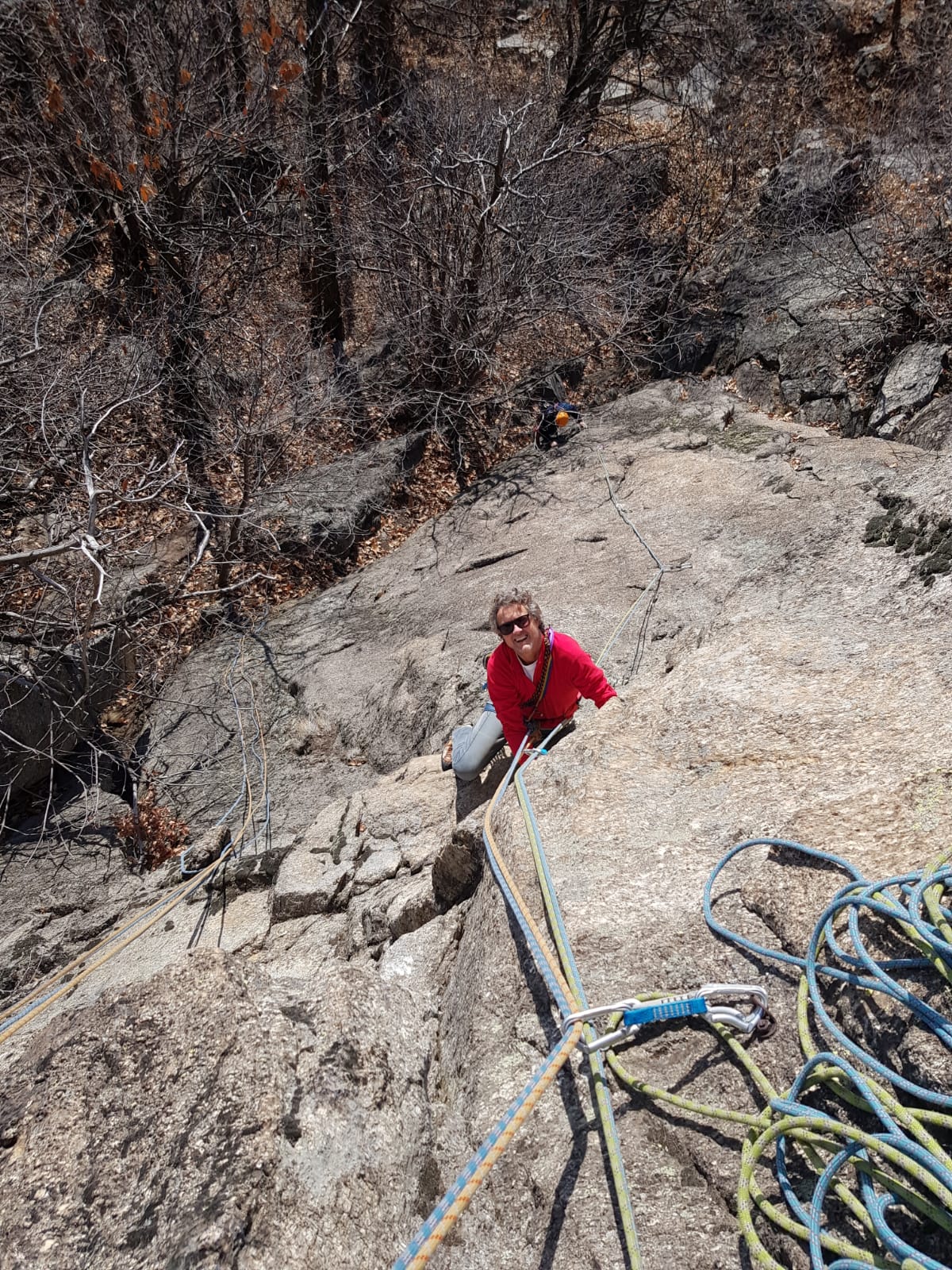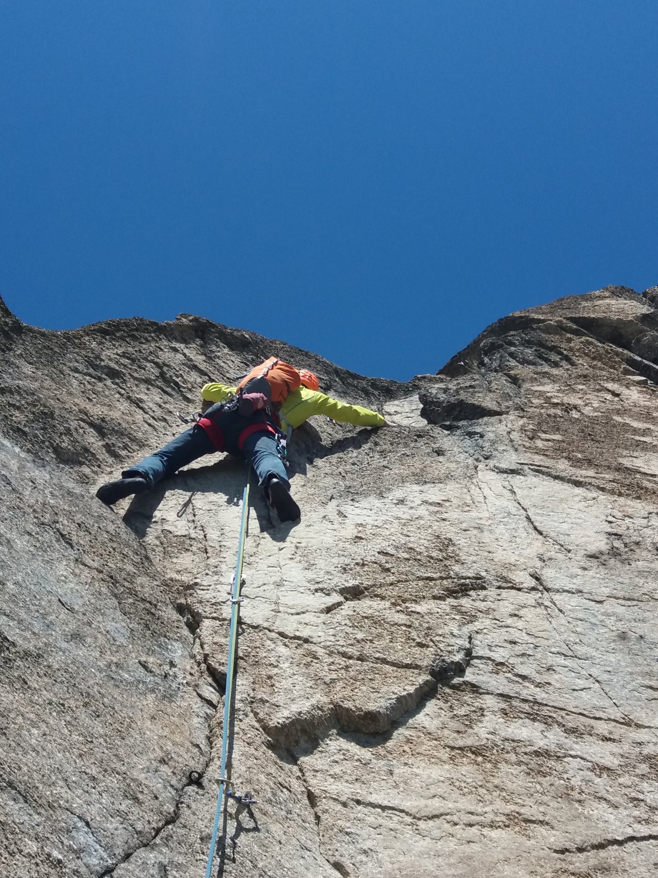 - VII tiro primo strapiombino delicato, poi più semplice fino al muretto finale di aderenza (chiodato corto ma non azzerabile) 6a+