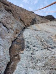 Salita la variante “La miccia e l’esplosivo”. La scorsa primavera avevo notato questa linea così ho pensato di andarla a salire con il socio di fiducia. L’idea iniziale era di uscire in cima allo sperone con 2 tiri, ma la parte alta della placca è inscalabile per noi. Così abbiamo salito questo monotiro che è un bel mix di arrampicata in fessura, tecnica e fisica! A noi è piaciuta molto.